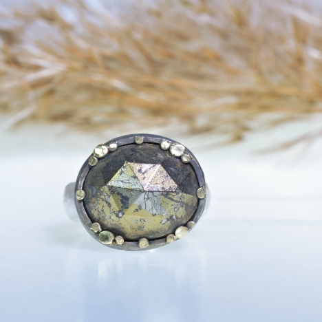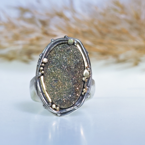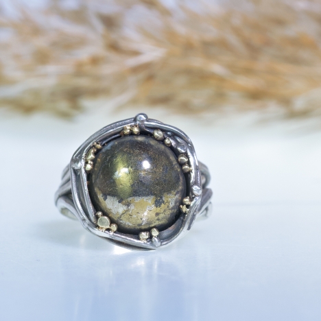 Prsten se “zlatým kamenem”: pyritem v křemeni a zlatými tečkami