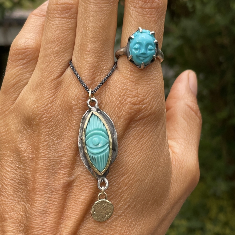 Originální náhrdelník s jasně modrým arizonským tyrkysem ručně gravírovaným do sybolu ochranného oka. Kombinace jemně patinovaného stříbra a zlata.