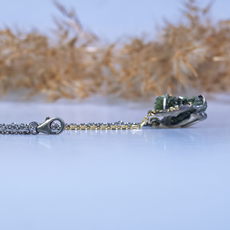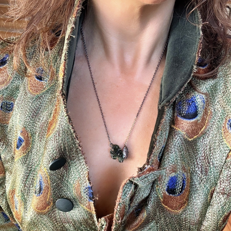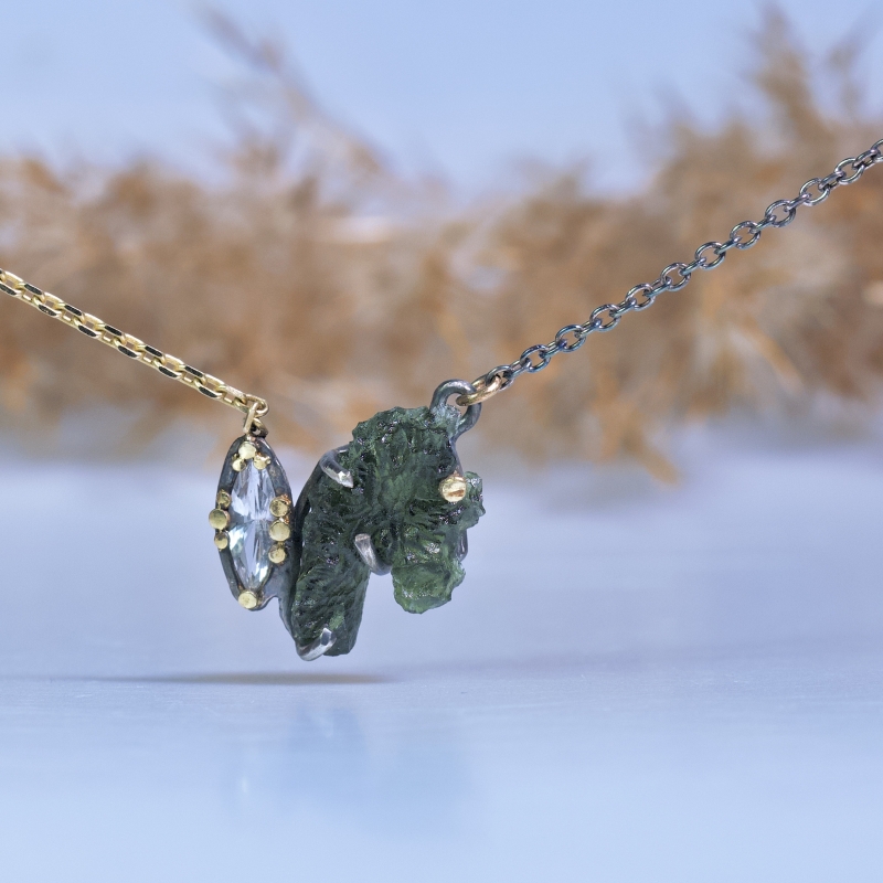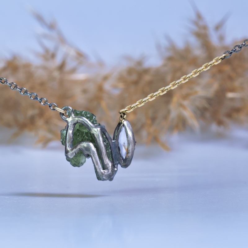Originální náhrdelník s přírodním neupravovaným vltavínem ve tvaru koňské hlavy a broušeným danburitem. 14k zlaté detaily kolem kamenů a část řetízku. Patinováno.