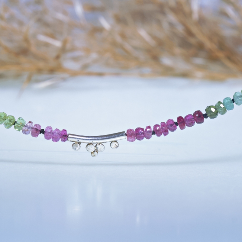 Náhrdelník z vícebarevných rondelek turmalínů se stříbrno zlatým ozdobným dílem uprostřed. Na černé hedvábné niti.