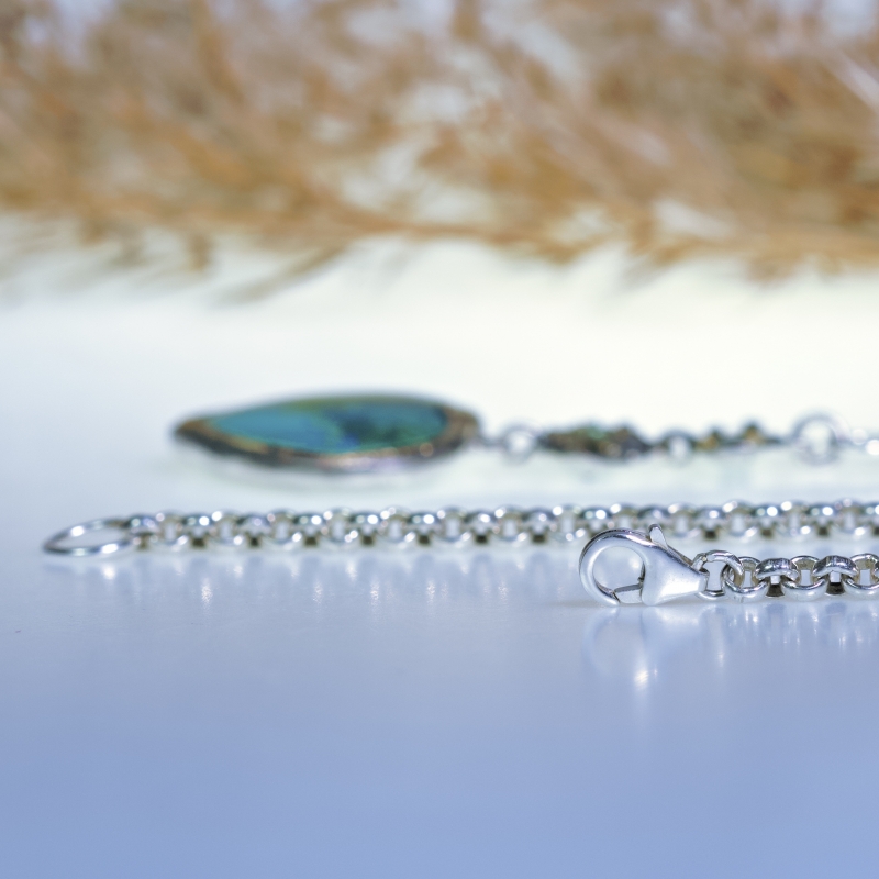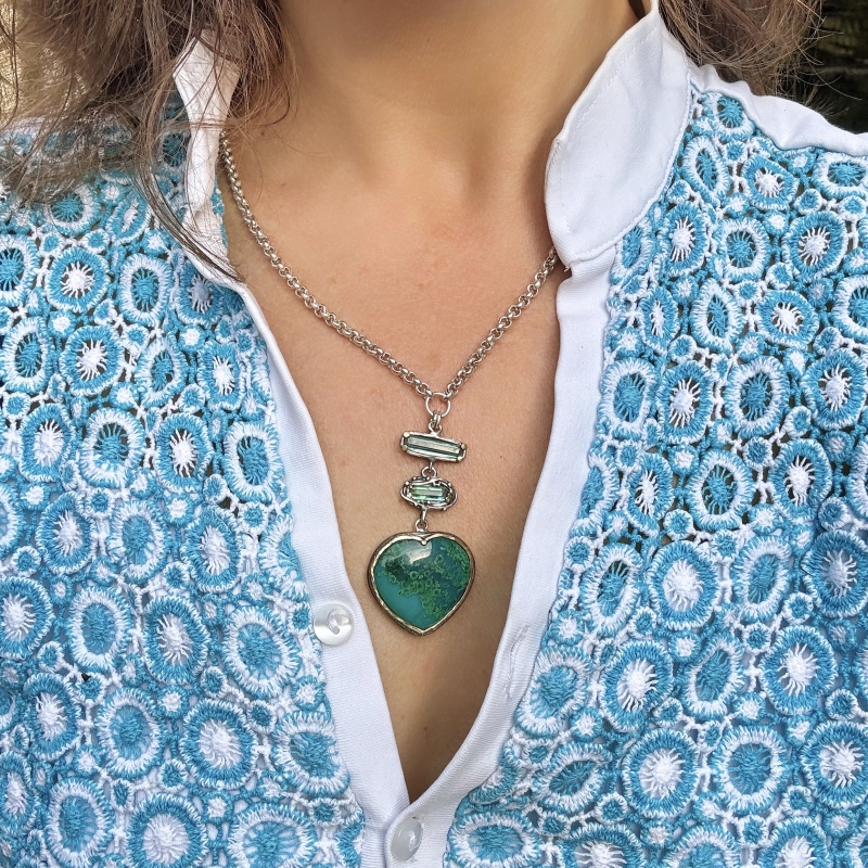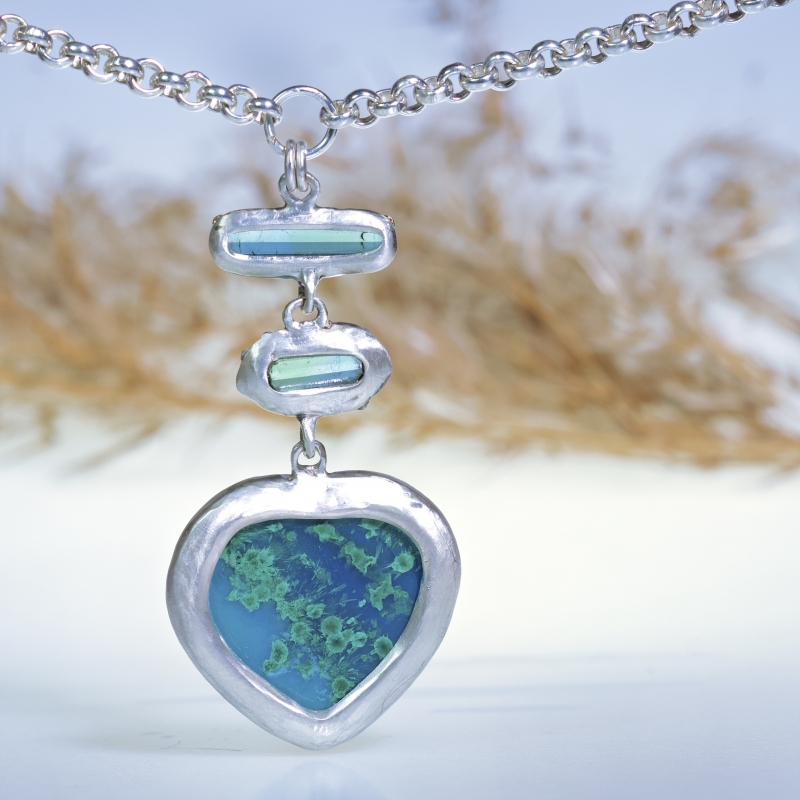 Originální náhrdelník s krásnou velkou gem silikou-chrysokolou ve tvaru srdce a dvěma modrozelenými turmalíny. 14k zlaté detaily kolem kamenů. Masivní stříbrný řetízek. Fotografie na krku je s kratší délkou řetízku než je stávajících 58cm.