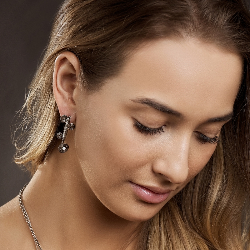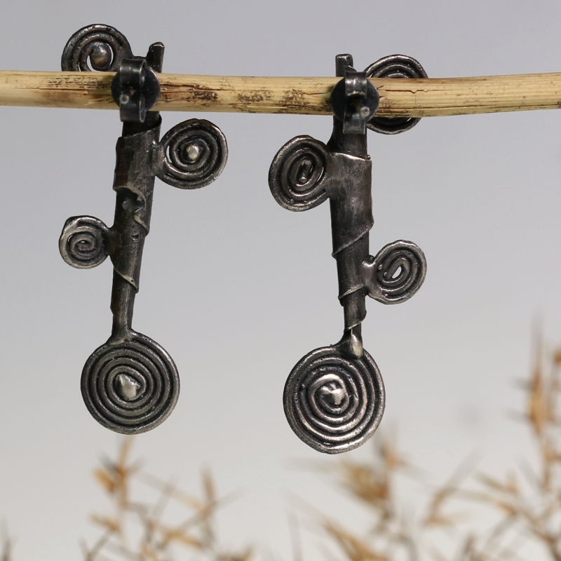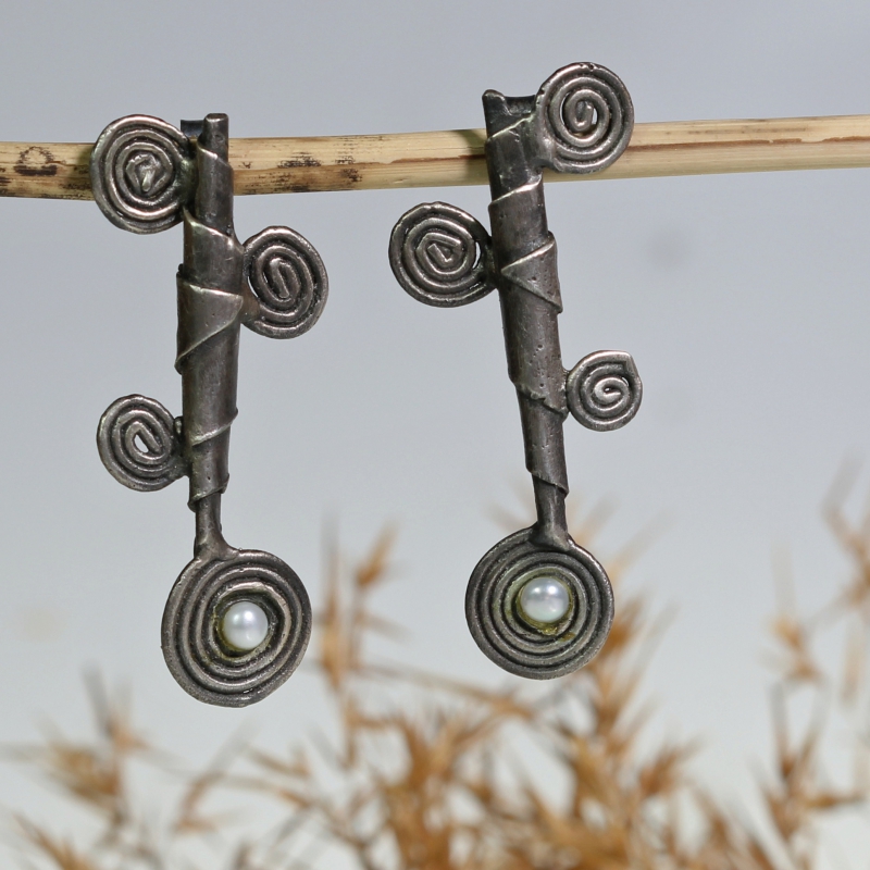 Náušnice na puzetu se třemi spirálami s malou říční perličkou. Patinované stříbro.