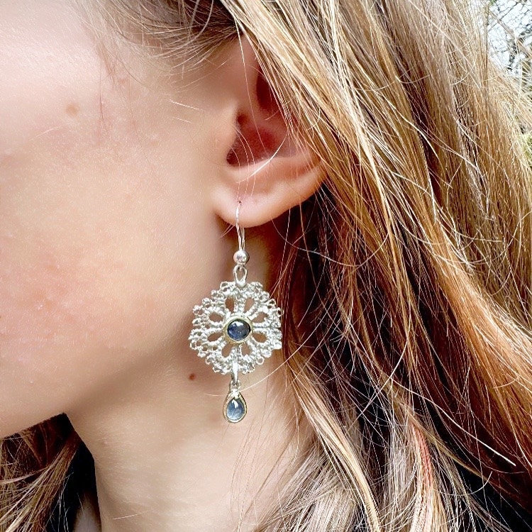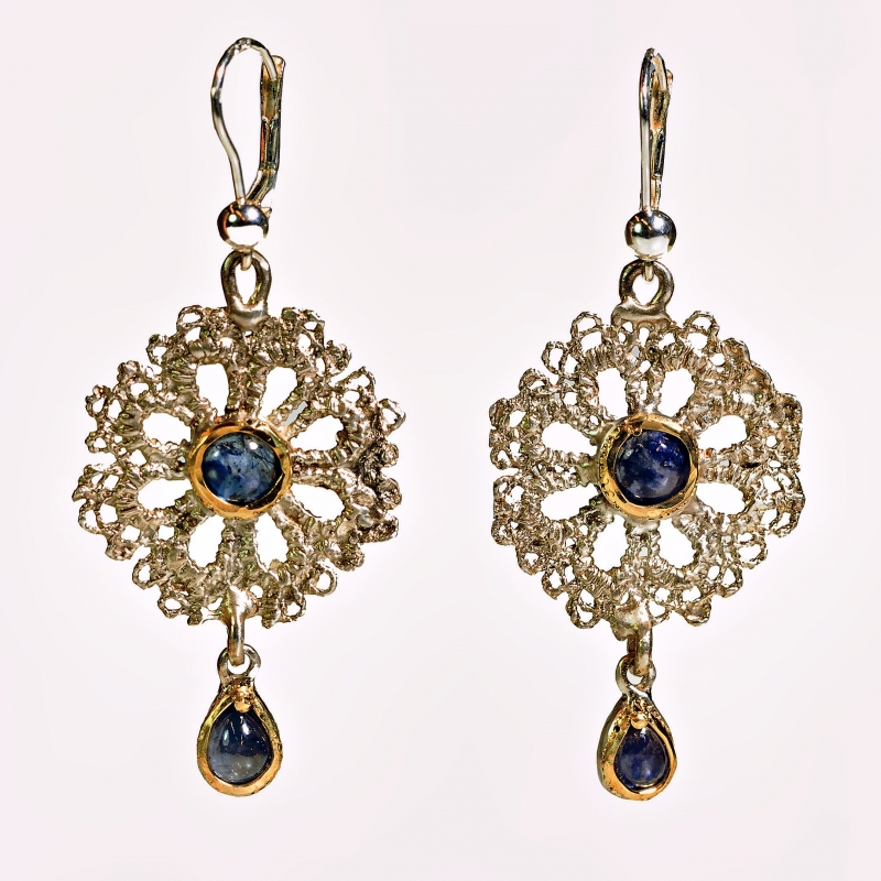 Originální visací krajkové náušnice ve tvaru květiny a modrými safíry. 14k linky kolem kamenů. Na jednoduchý háček, který lze vyměnit za zapínání na klapku.