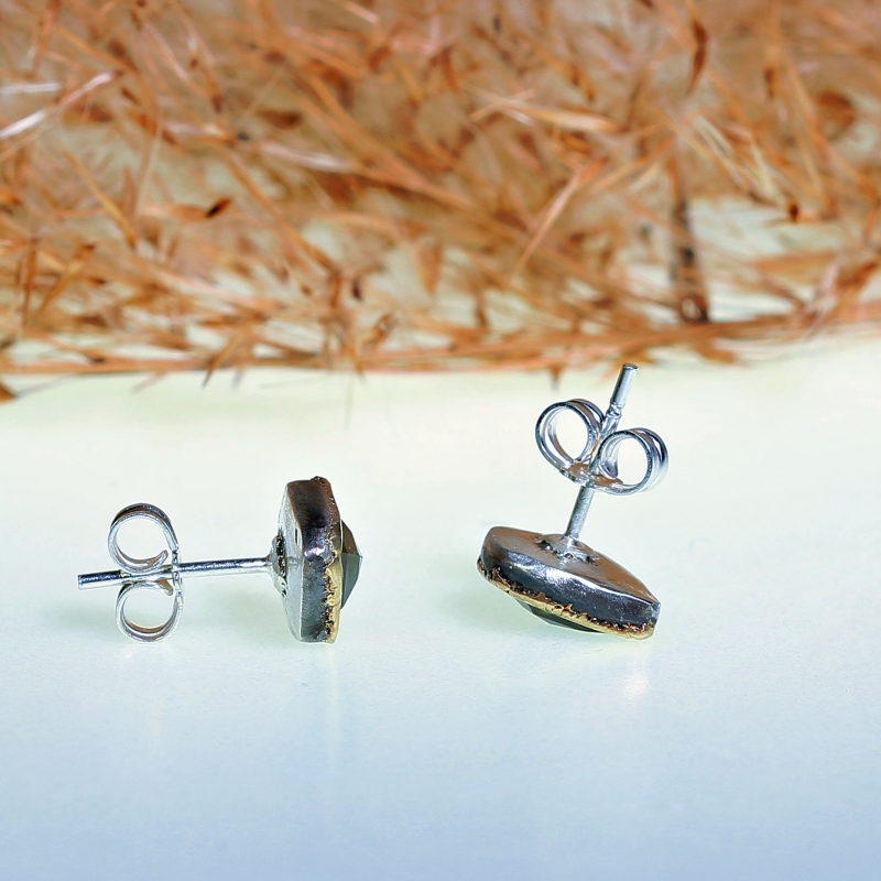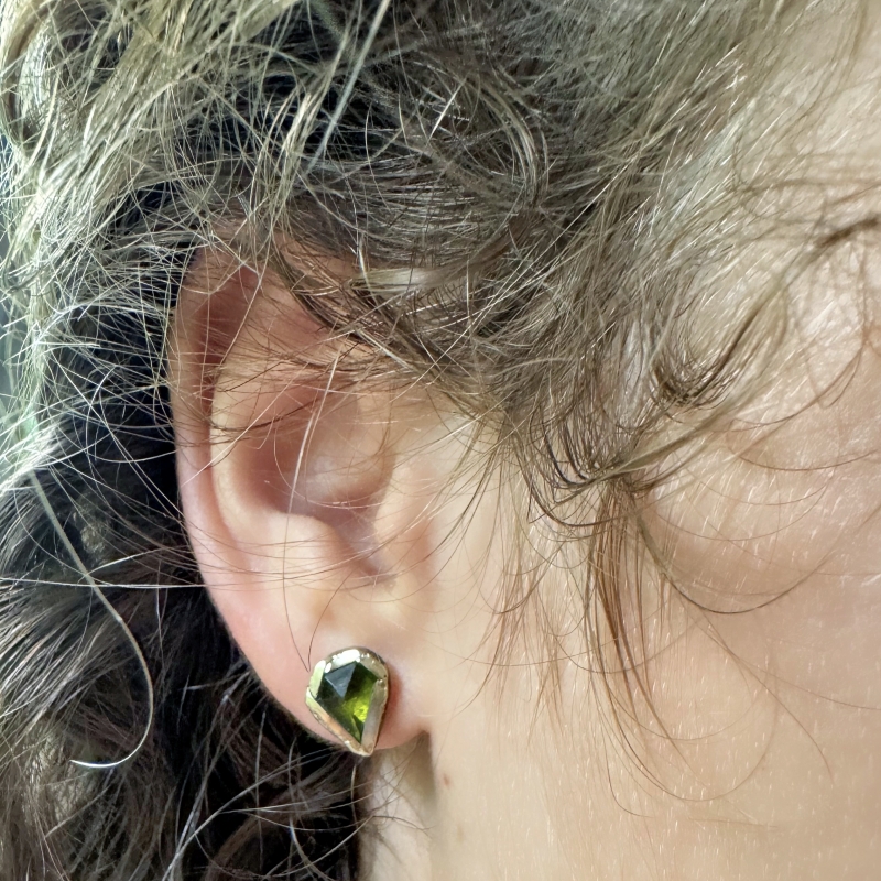 Originální náušnice na puzetu se zelenými turmalíny v geometrickém brusu. 14k zlatá linka kolem kamenů. Vyobrazené jsou prodané, ale ráda vyrobím obdobné, tvar kamenů si liší.