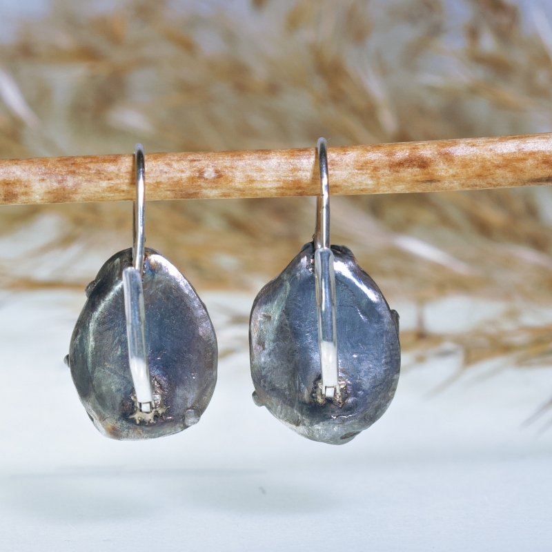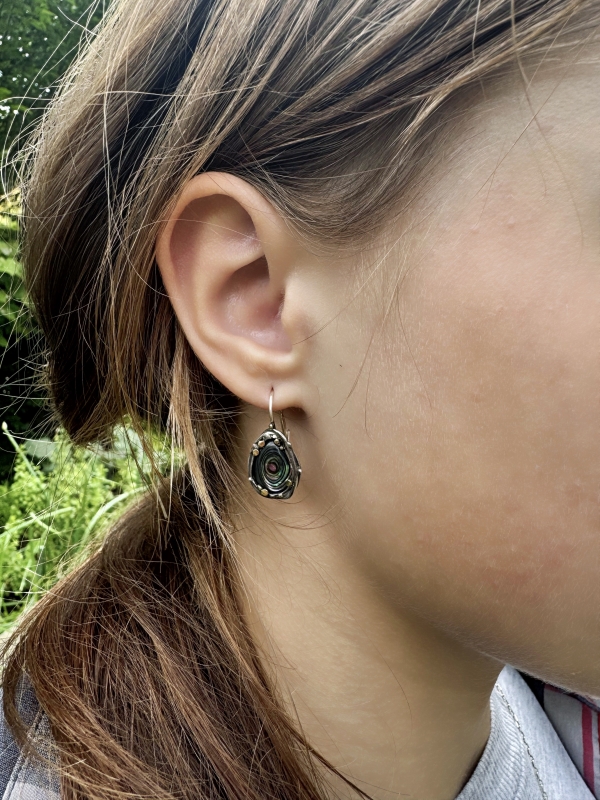 Originální jemné náušnice s krásnou mušlovinou Paua, strukturou a zlatými detaily kolem mušlí. Klasické zapínání na klapku. Patinováno.