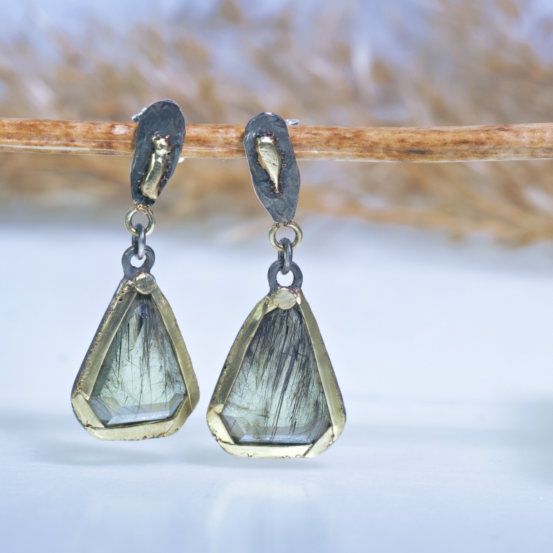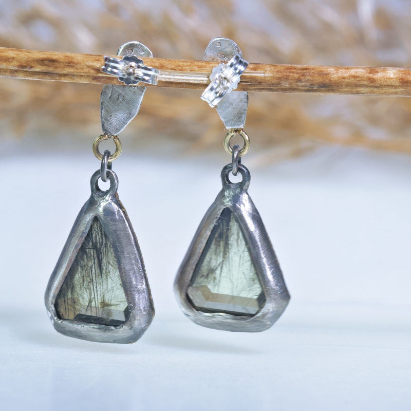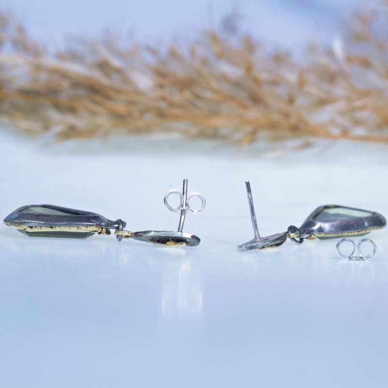 Originální náušnice na puzetu s olivíny s inkluzemi minerálu Ludwigitu. 14k zlaté lemování. Patinováno.