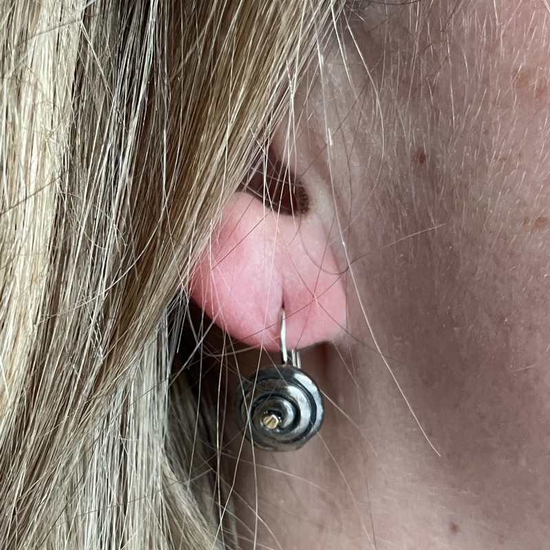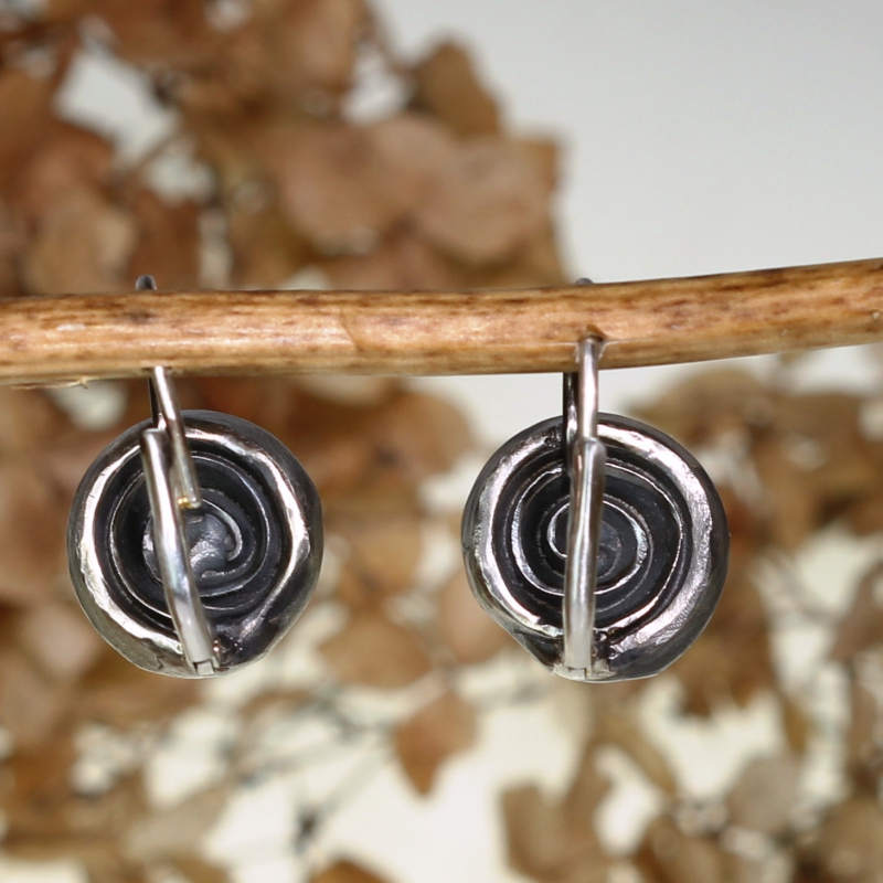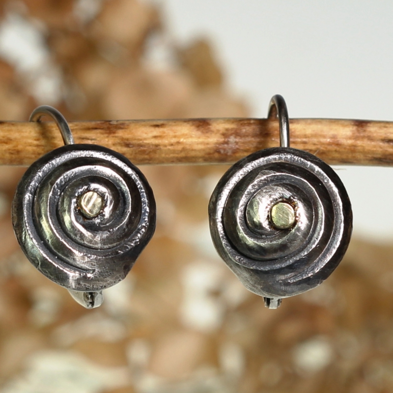 Stříbrné náušnice ve tvaru spirály se zlatou tečkou. Klasické zapínání na západku, jemná patina.