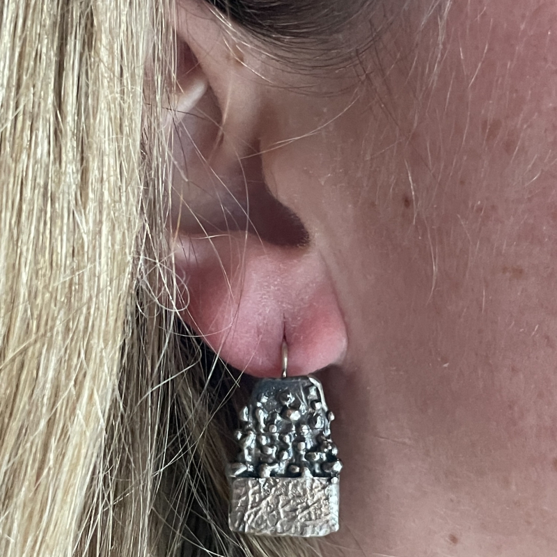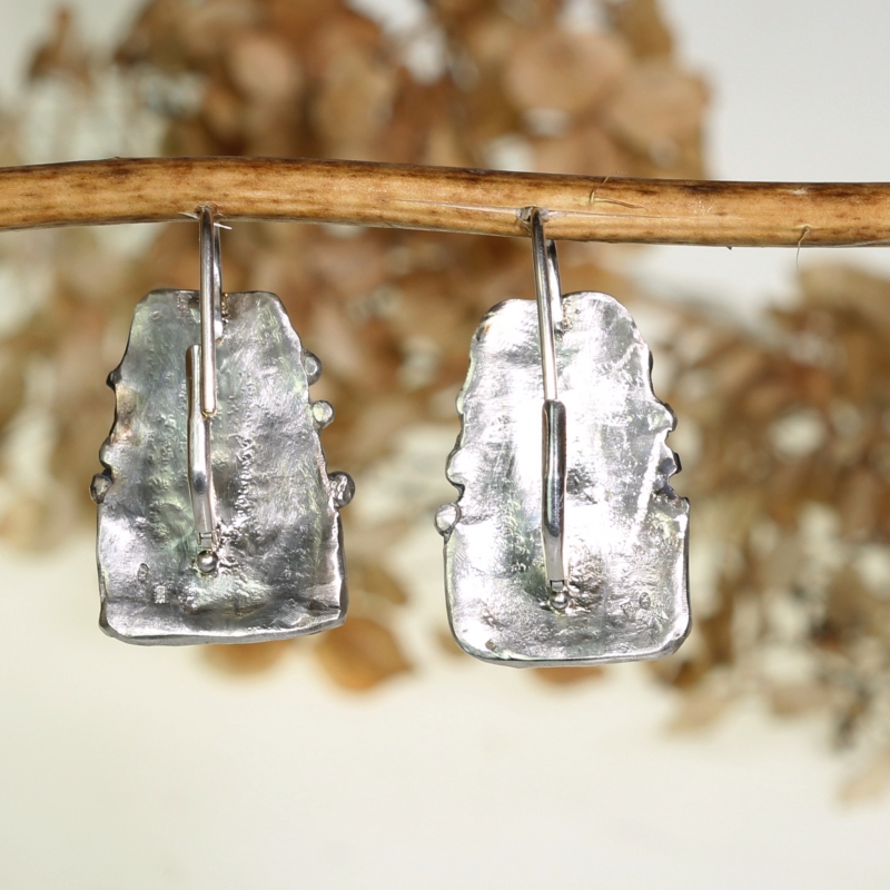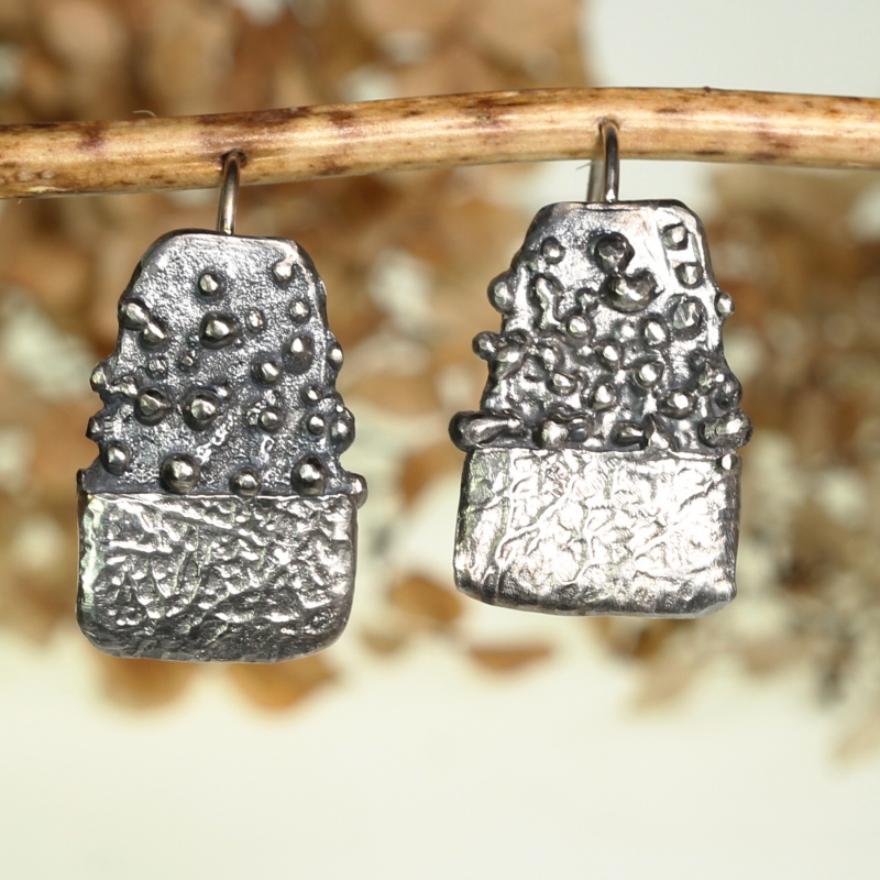 Visací stříbrné náušnice symbolizující Zemi a měsíční oblohu. Jemná patina. Zapínání na západku nebo na jednoduchý háček se zajištěním.