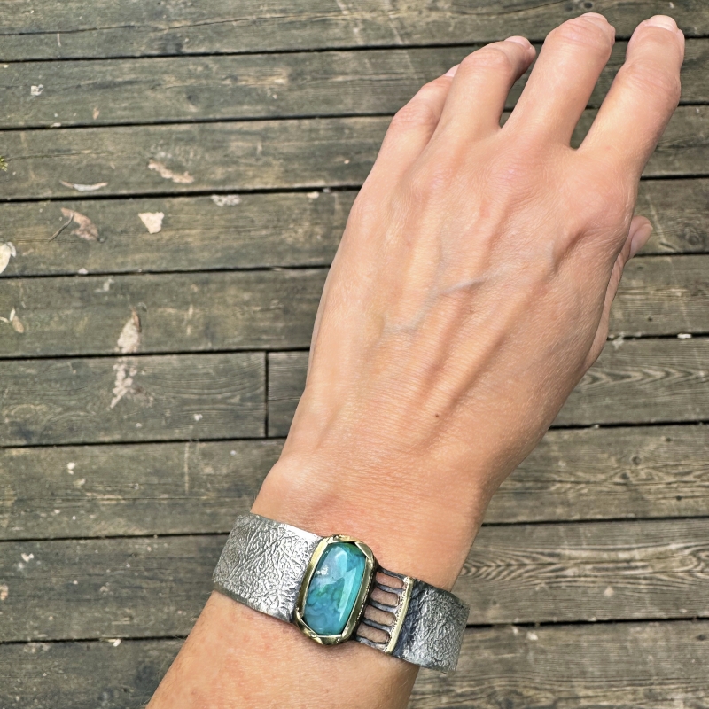 Originální otevřený pevný náramek s gem silicou - chrysokolou. 14k zlaté detaily kolem kamene a na náramku. Strukturované stříbro.