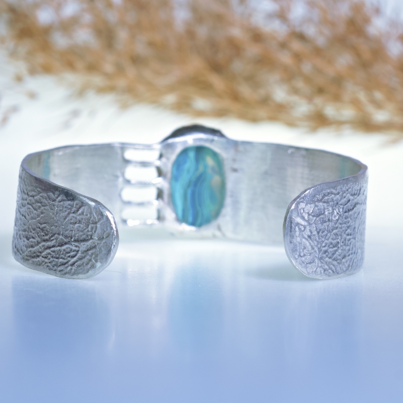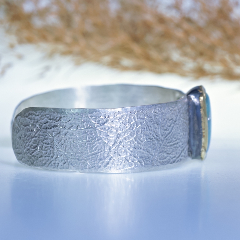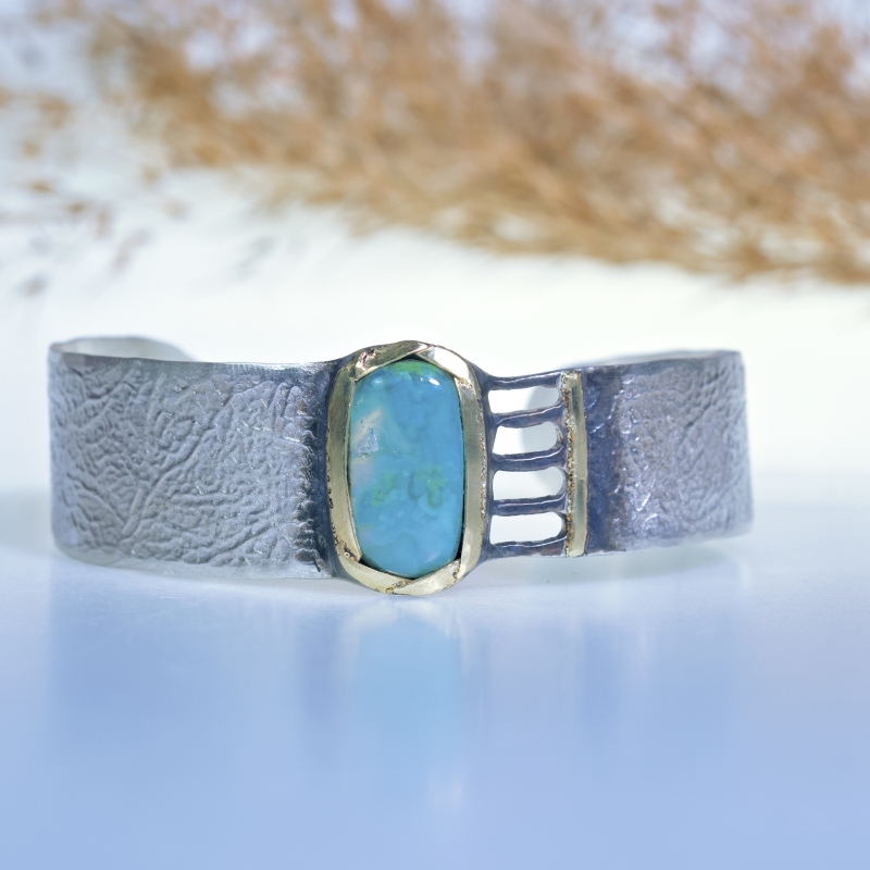 Originální otevřený náramek z kolekce Simply metals. Vyobrazený je se zlatými pásky a jemnou patinou, vzor zlatých pásku a teček připomíná ornament slunečních paprsků. Obvod zápěstí prosím napište do poznámky.