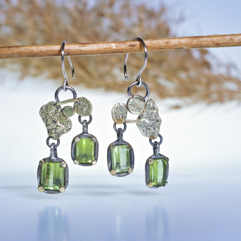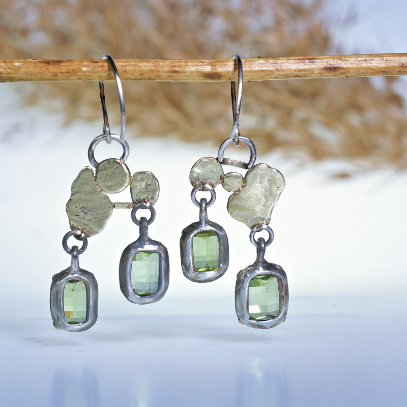 Originální výrazné visací náušnice s velkými růžovo-černými turmalíny. 14k zlatá linka kolem kamenů, růžové zlato.