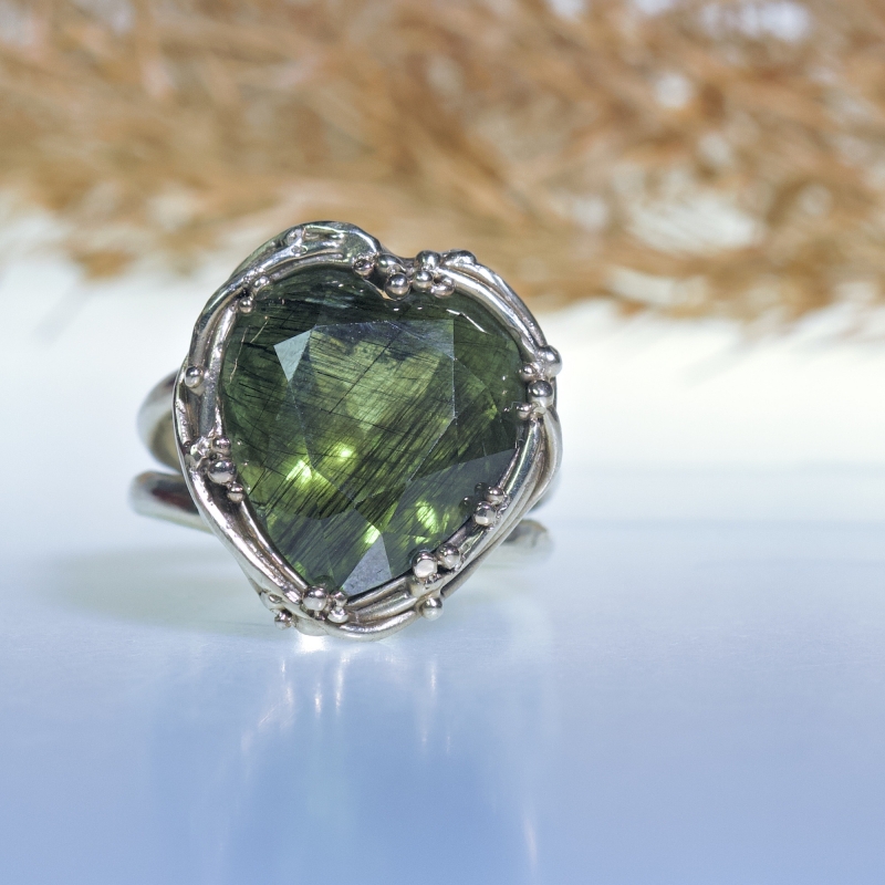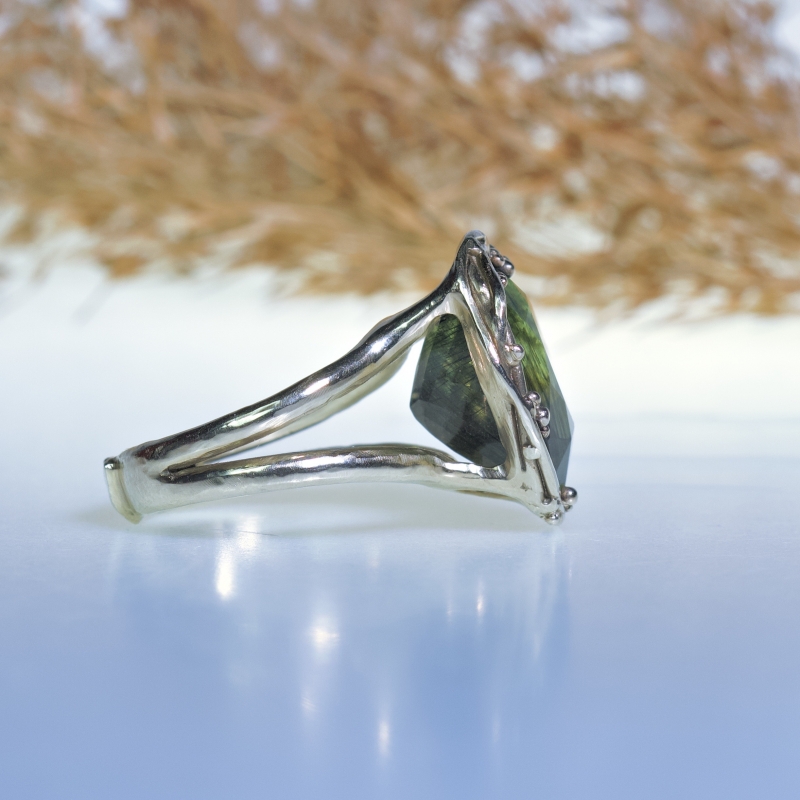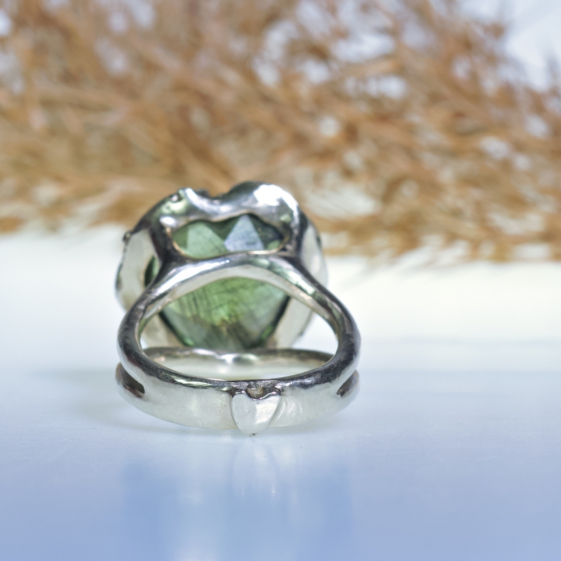 Originální prsten s kulatým broušeným prehnitem. 14k zlaté tečky kolem kamene. Jemná patina.