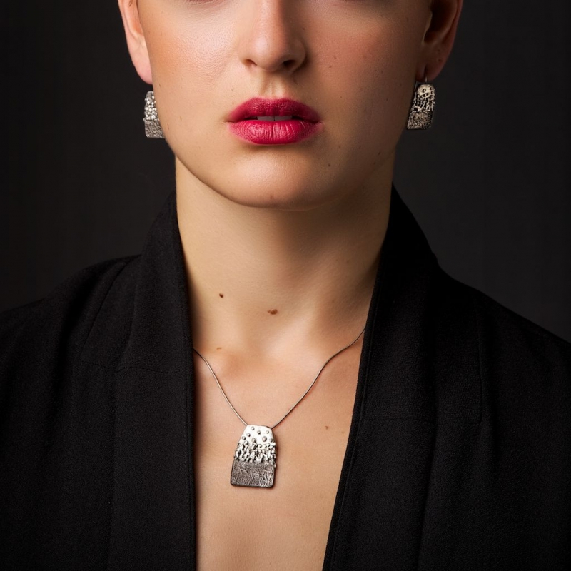 Stříbrný přívěšek symbolizující Zemi a měsíční oblohu. Na řetízku hádku nebo obruči, částečně patinovaný. Délku lze volit na přání.