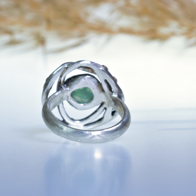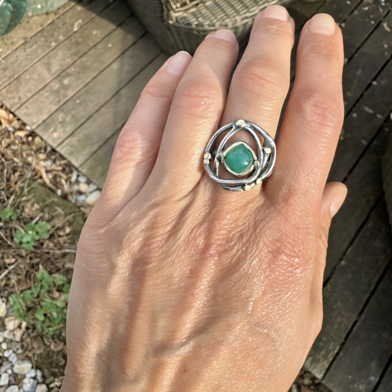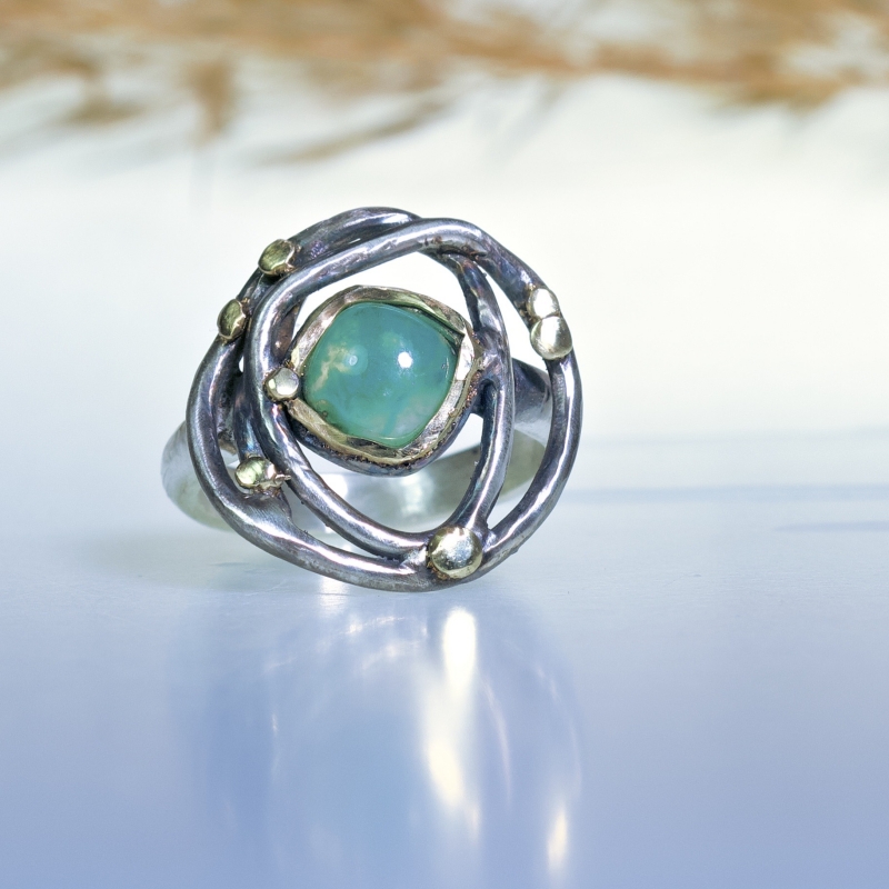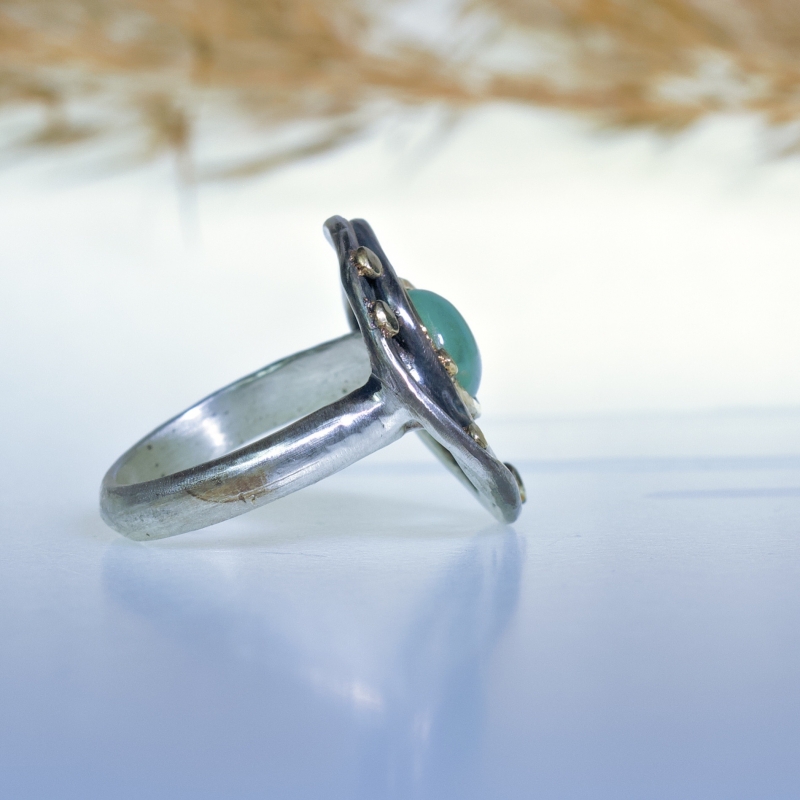 Originální prsten s malou gem silikou - chrysokolou. 14k zlatá linka a tečky kolem kamene. Jemně patinováno.