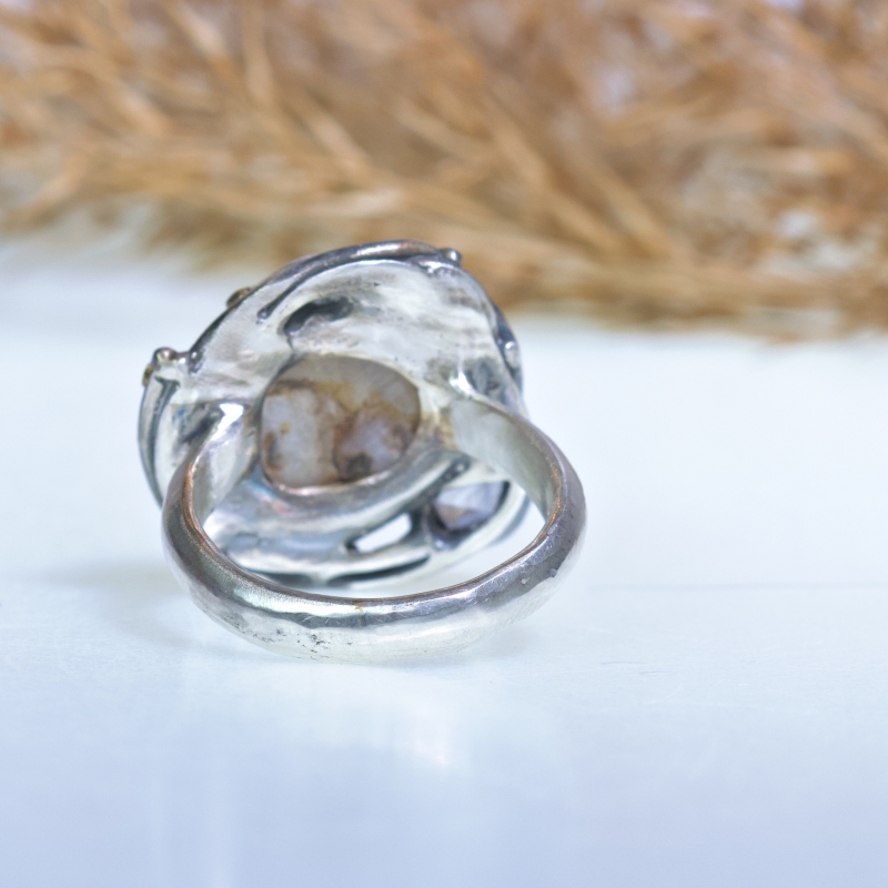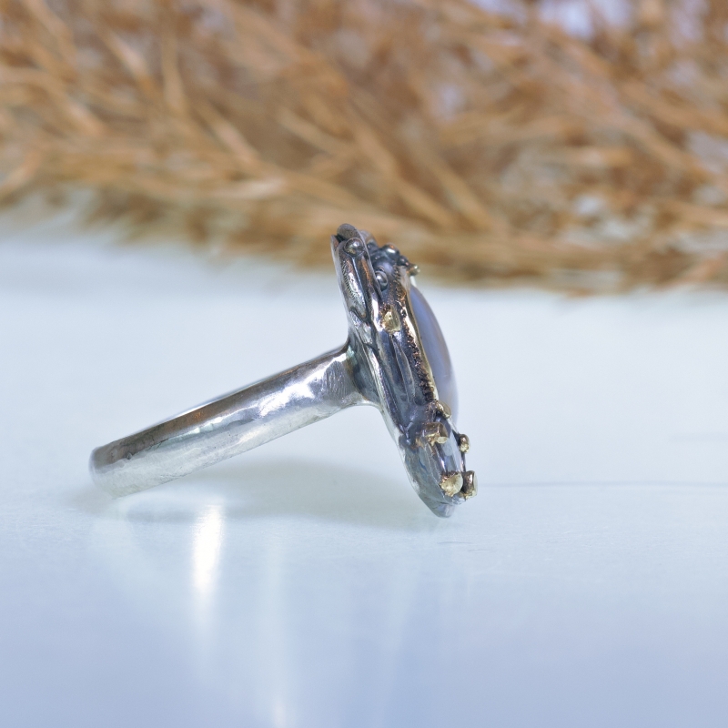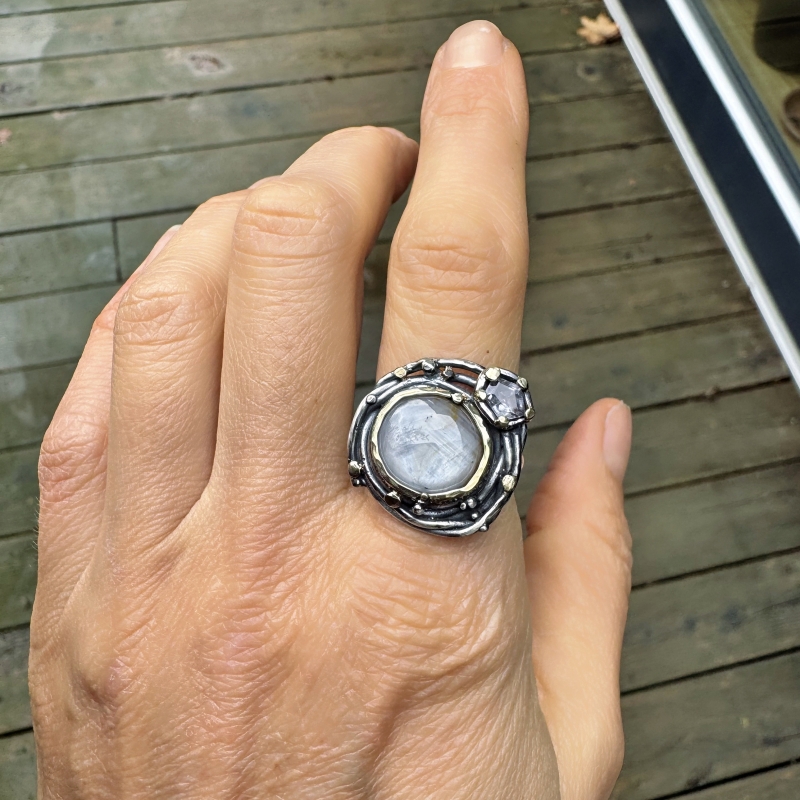 Originální prsten s vzácným asterickým safírem (při bodovém osvětlení žárovnkou nebo při svitu slunce se na povrchu safíru pohybuje hvězda) a malým broušeným světle šedým spinelem. 14k zlaté detaily kolem kamenů, jemná patina.