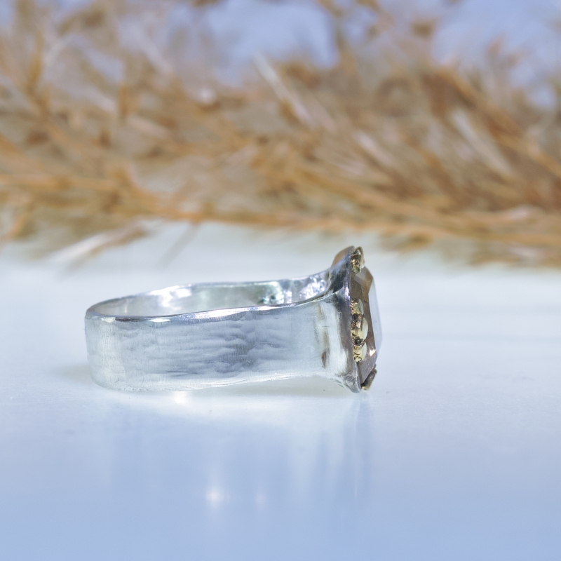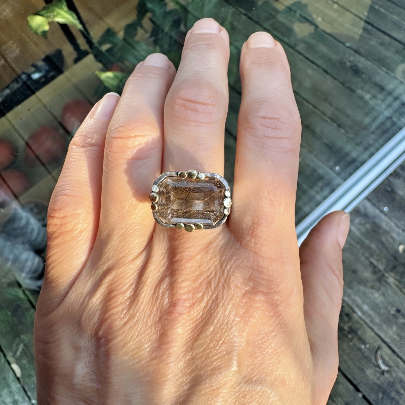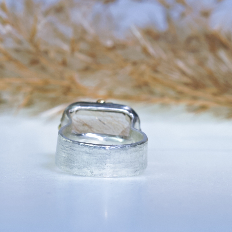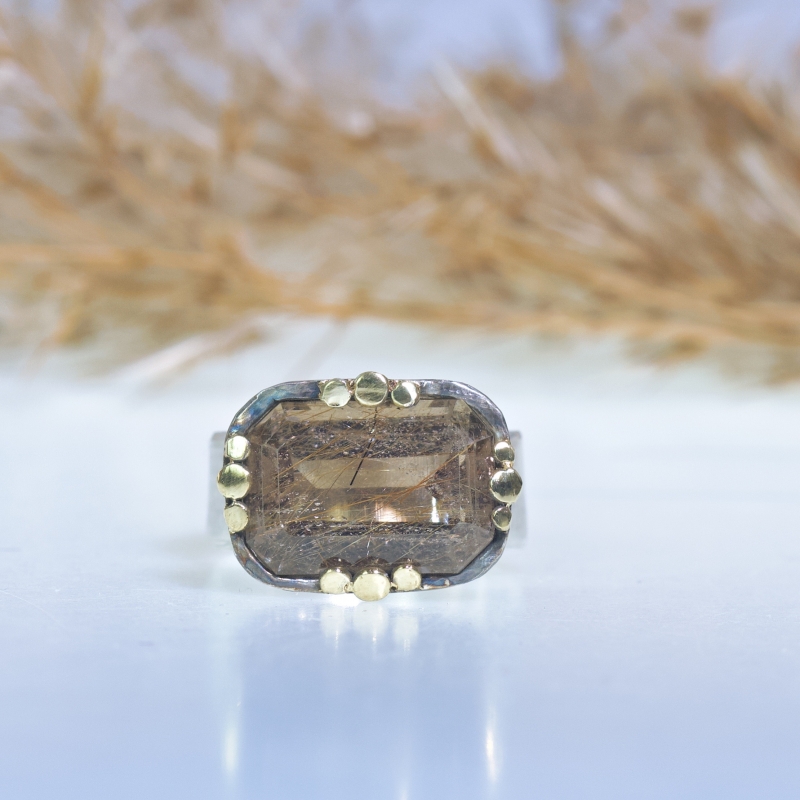 Originální prsten s širší hladkou obroučkou a obdélníkovým broušeným sagenitem (venušiny vlasy nebo zlatý rutil). 14k zlaté tečky kolem kamene.