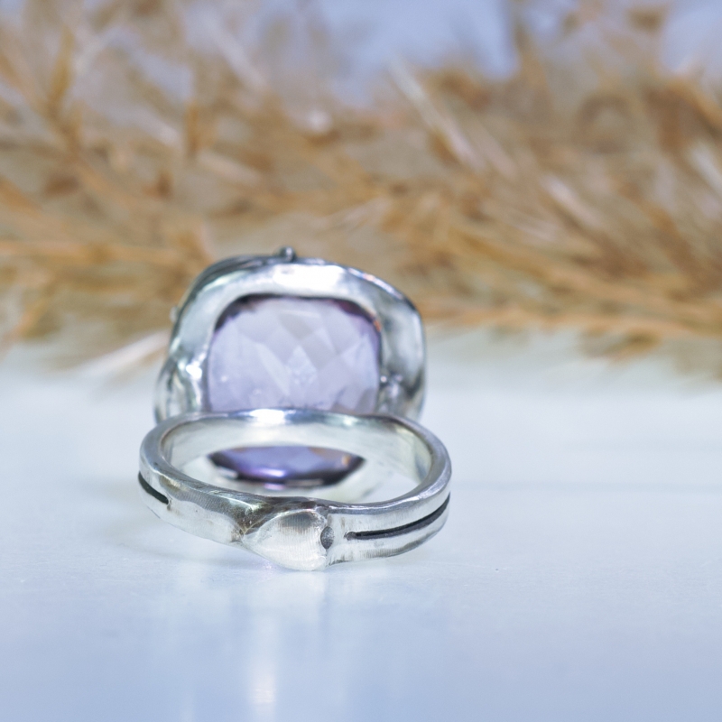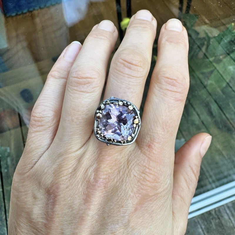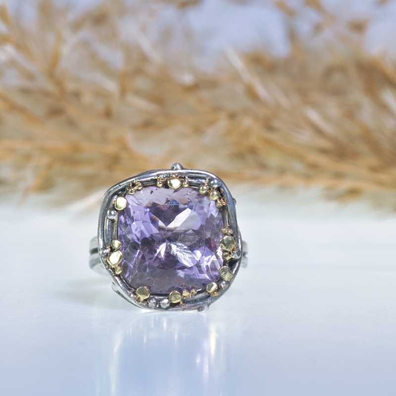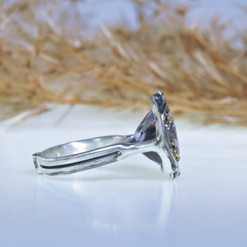 Originální prsten s překrásným broušeným ametystem světle fialové barvy. 14k zlaté detaily kolem kamene.