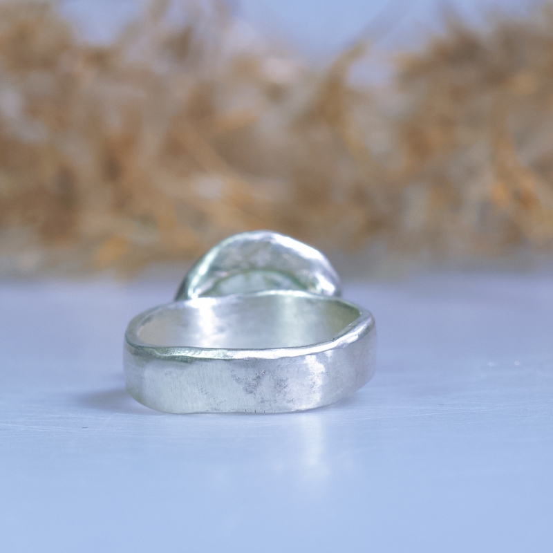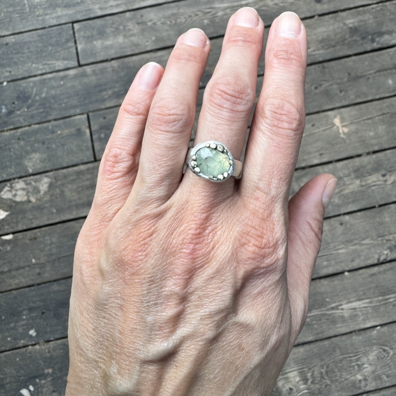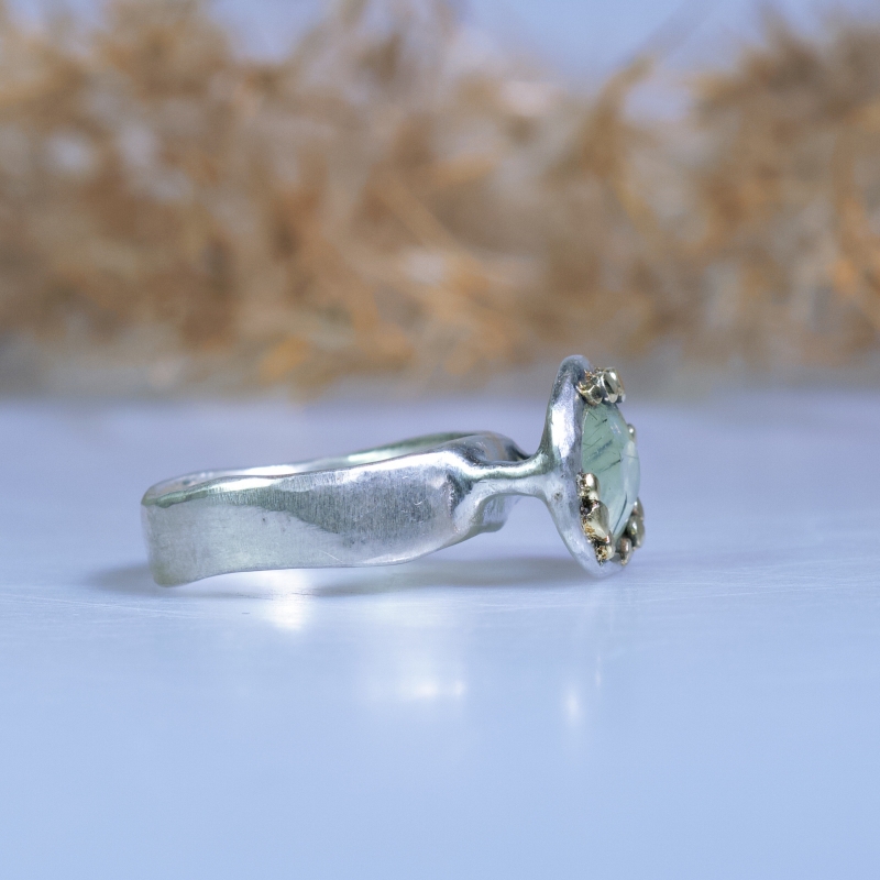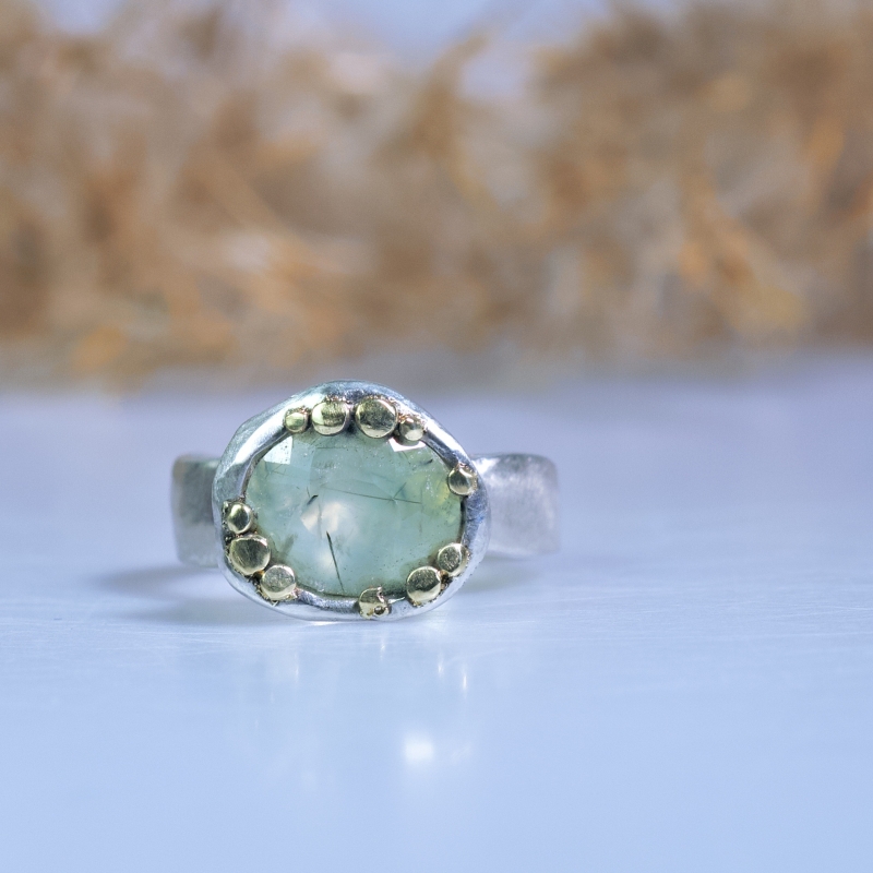Originální prsten s překrásným broušeným prehnitem s jemnými inkluzemi. 14k zlaté tečky kolem kamene. Na přání může být patinován.