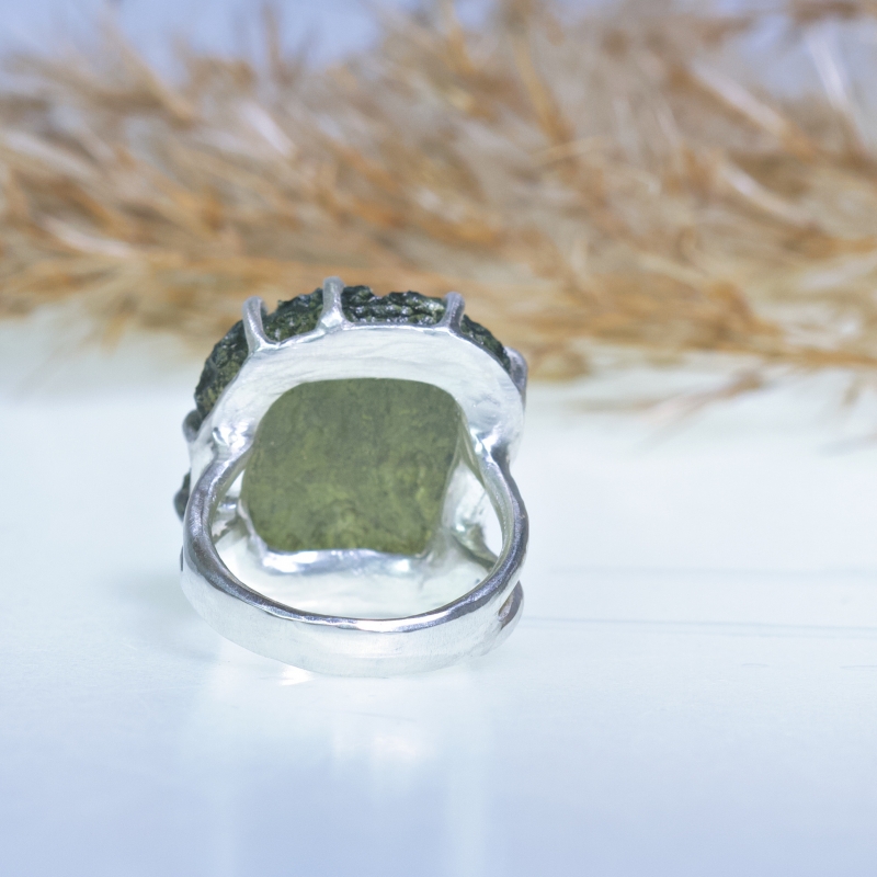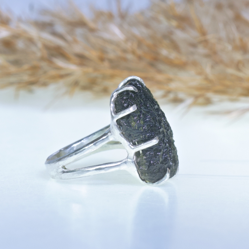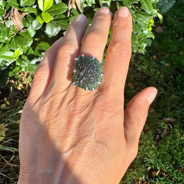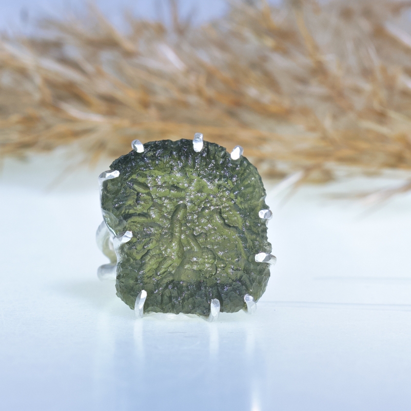 Originální prsten s velkým surovým vltavínem s nádhernou skulptací. Zdvojená obroučka, uchycení do krapen.