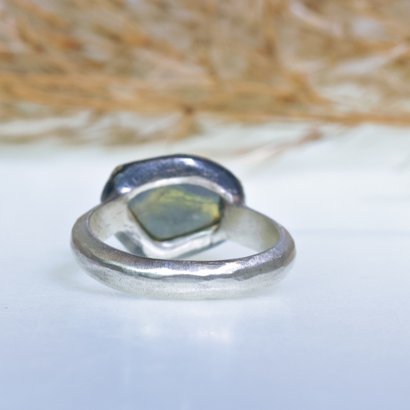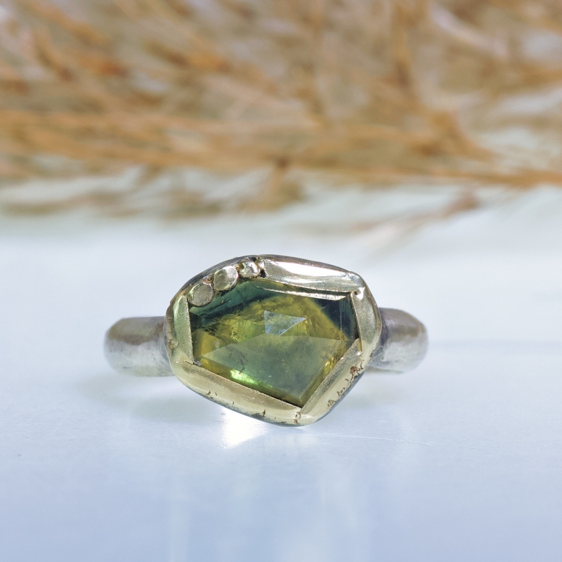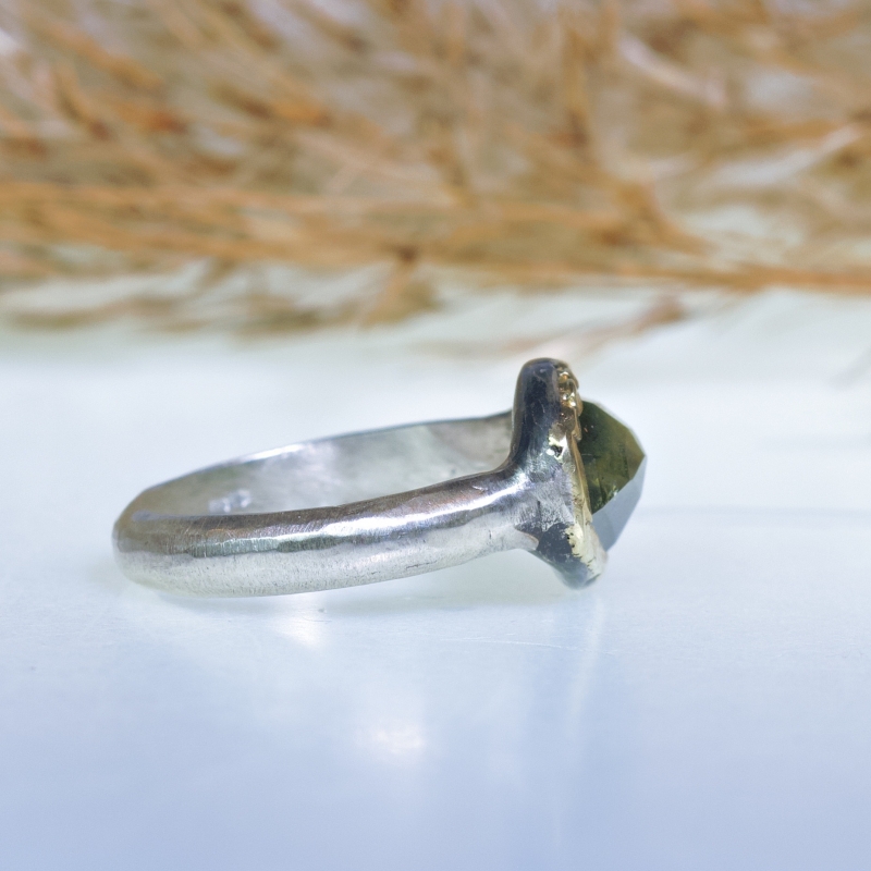 Prsten se safírem z Keni v geometrickém routovém brusu. 14k zlaté detaily kolem kamene, jednoduchá půlkulatá obroučka. Pouze tento jeden.