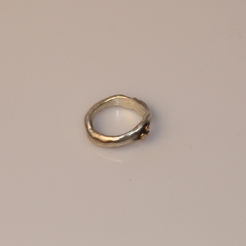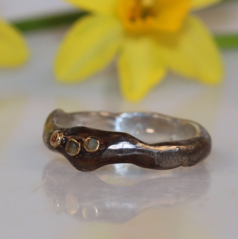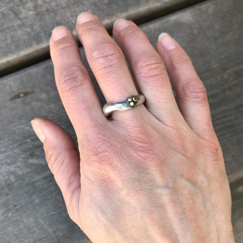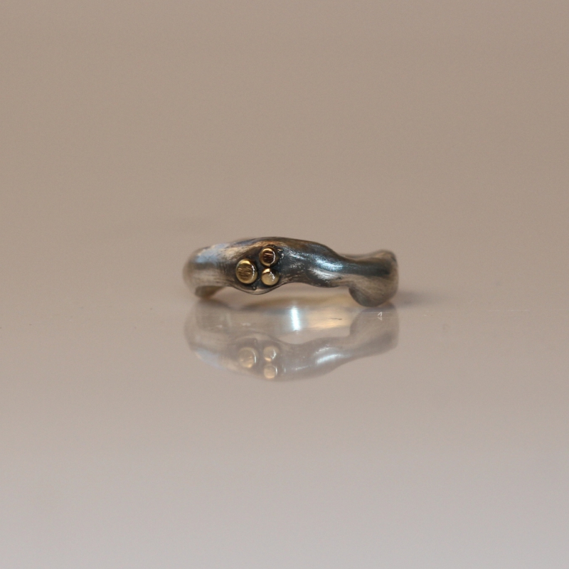 Originální prstýnek organického nepravidelného tvaru se třemi tečkami ze 14k zlata uspořádanými u sebe. Podle požadavku lze vyrobit prsten s různým uspořádáním teček. Šířka oboučky je cca 4mm. Částečně patinováno. Velikost na přání.