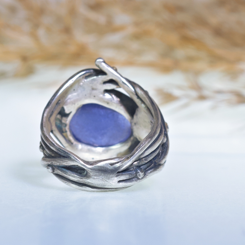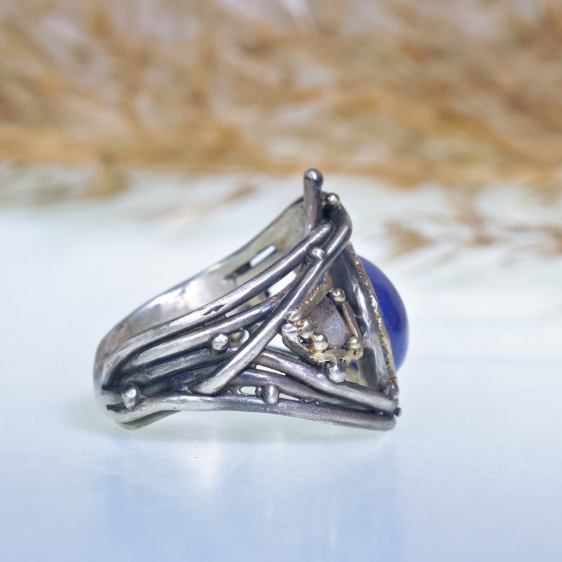 Široký originální prsten s velkým oválným tanzanitem a morganitem. 14k zlaté detaily kolem kamenů a na obroučce, jemná patina.