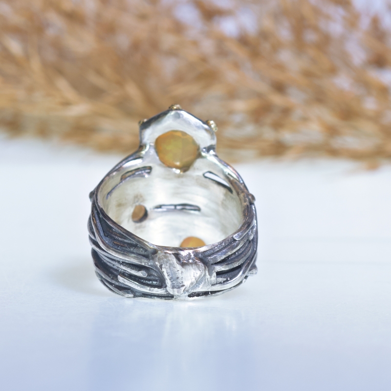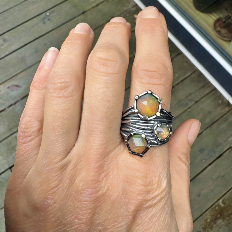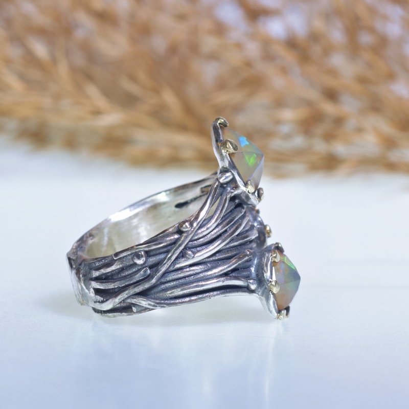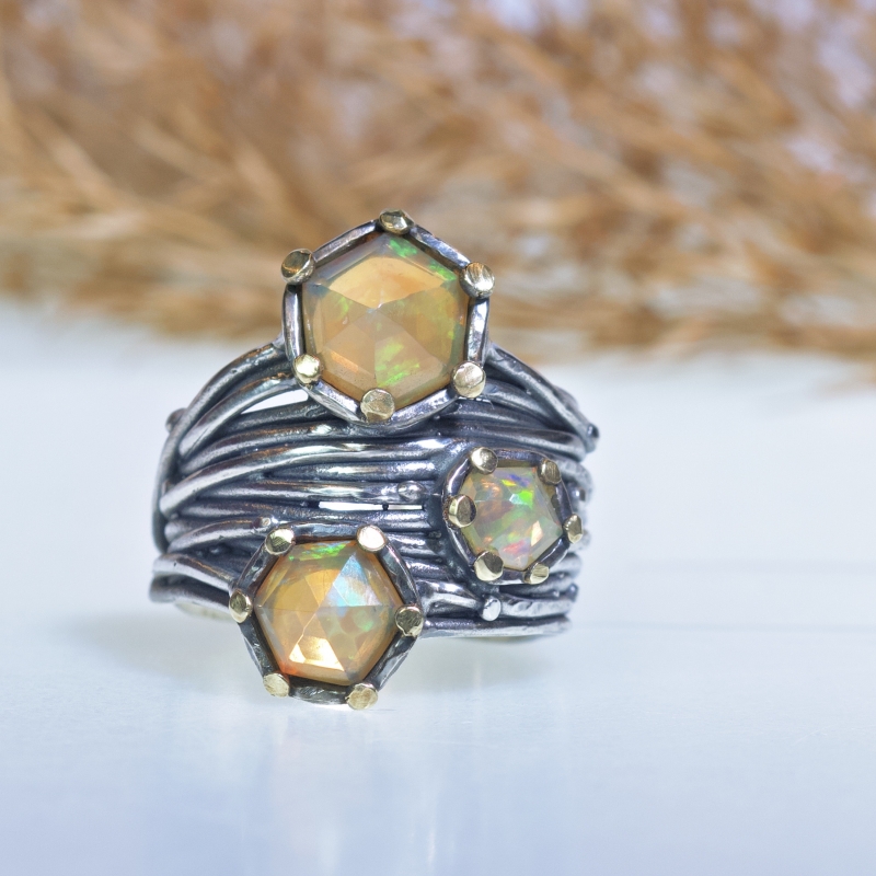 Originální širší prsten typu Galaxy se třemi broušenými etiopskými opály. 14k zlaté tečky kolem kamenů. Patinováno.
