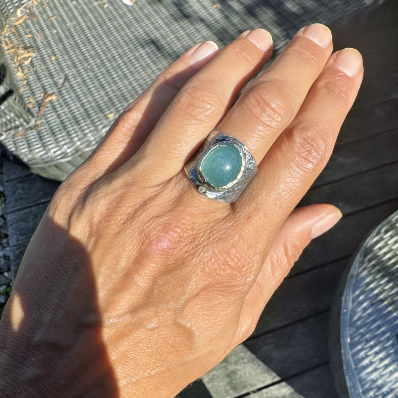 Originální širší prsten s oválným grandidieritem a 14k zlatou linkou dokola. Na přání lze obroučku napatinovat.