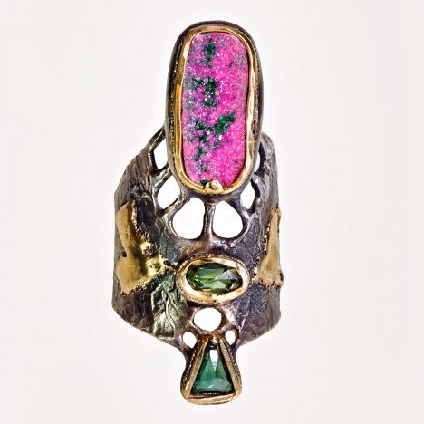 Široký výrazný prsten se se dvěma safíry z Keni v routovém geometrickém brusu. 14k zlaté detaily kolem kamenů a na strukturované obroučce, patinováno.