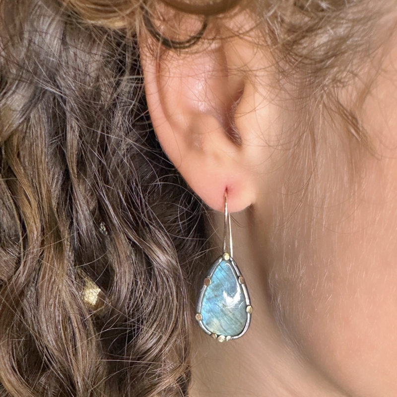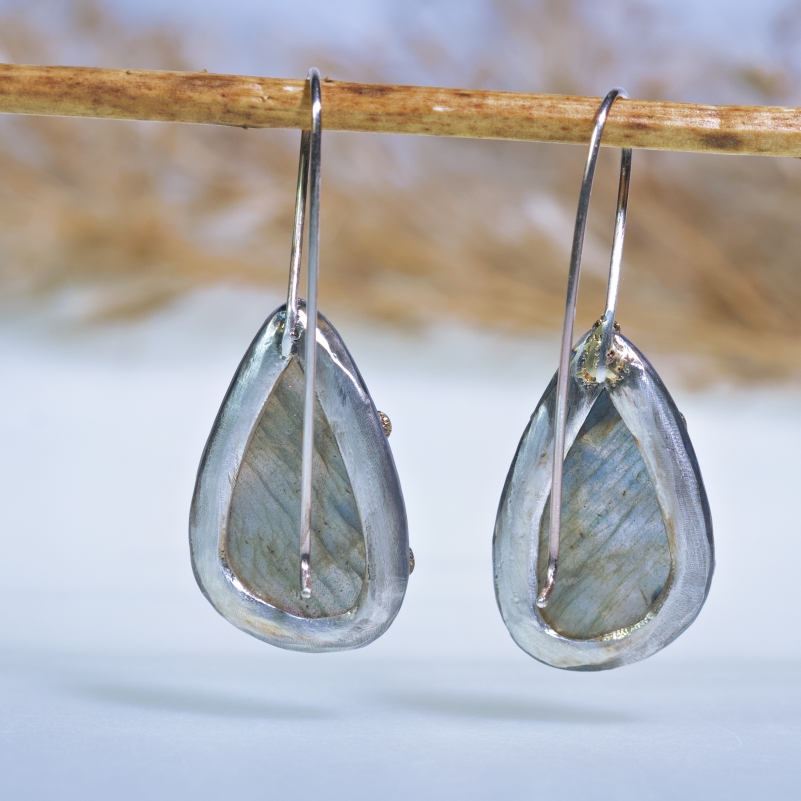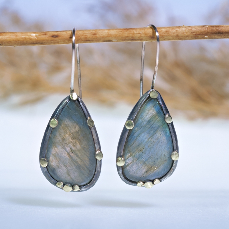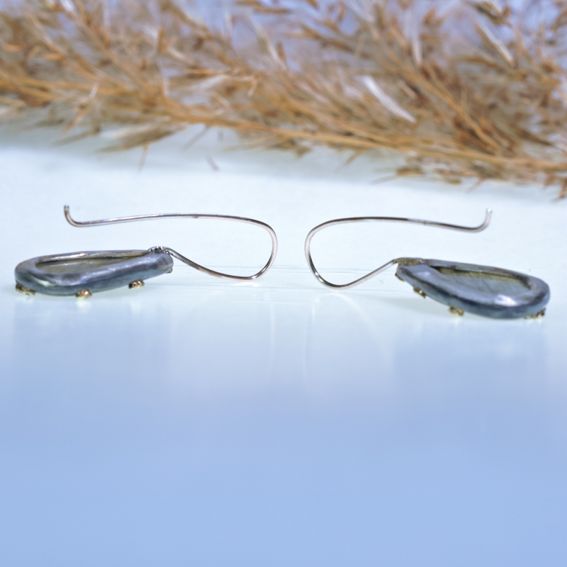 Originální visací náušnice s modrozelenošedými labradority. 14k zlaté tečky kolem kamenů, patinováno.