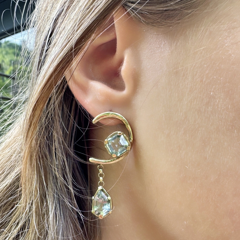 Originální výrazné náušnice ze žlutého 14k zlata se čtyřmi broušenými akvamaríny. Na šroubovací nebo nasouvací puzetu dle vašeho přání.