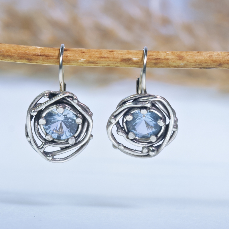 Originální 14k zlaté náušnice s organickou strukturou a krásnými zářivými jemně modrými topazy.
