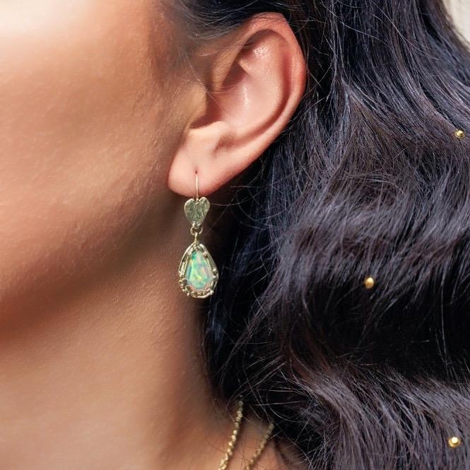 Originální 14k zlaté náušnice s etiopskými opály v top kvalitě v geometrickém brusu. Opály mají nádhernou hru barev a odlesků. Struktura kolem kamenů a na srdíčkách, zapínání na klapku.