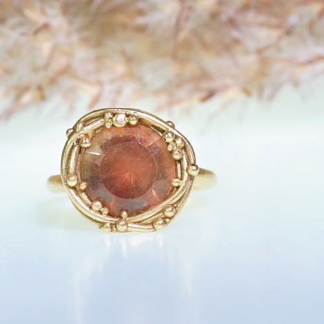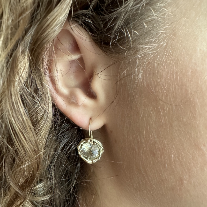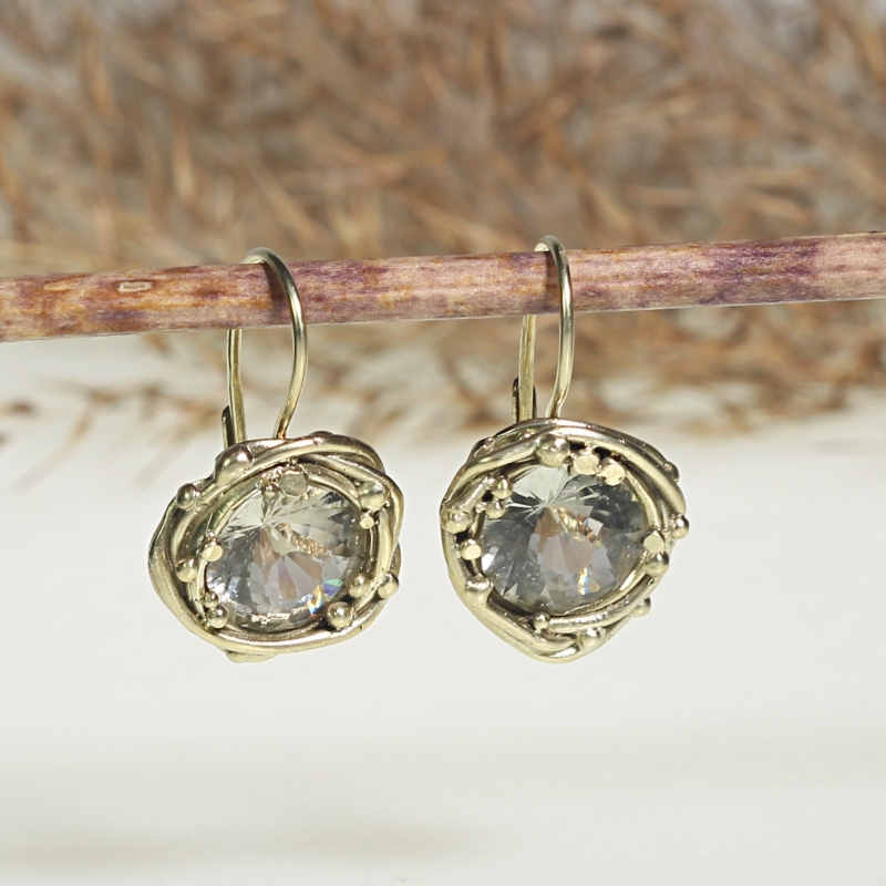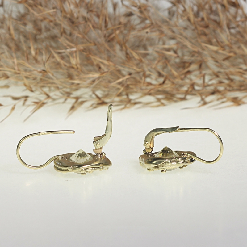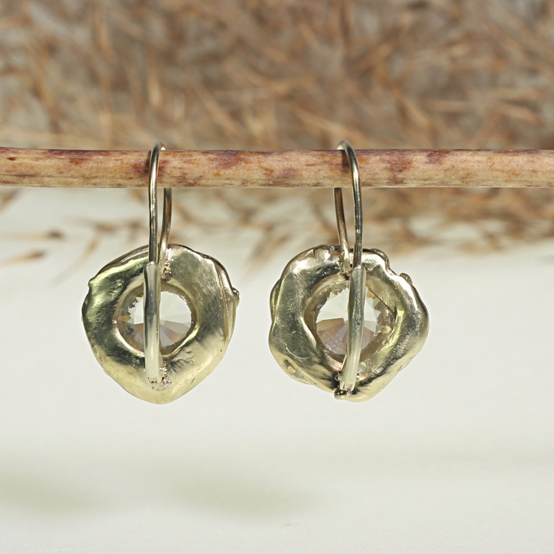 Visací 14k zlaté náušnice s klulatými broušenými oregonskými slunečními kameny v barvě champagne. Charakteristické osazení kamene, klasické zapínání na klapku. Kameny mají jemnou barvu a krásný brus, který silně odráží světlo.