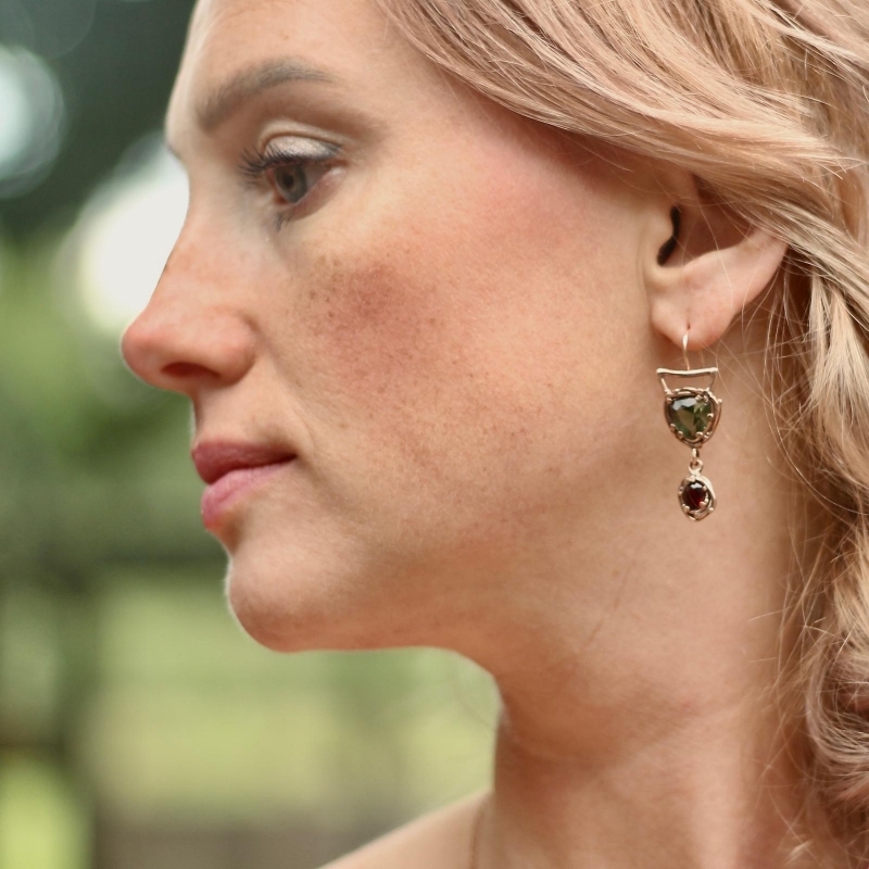 Originální náušnice ze 14k růžového zlata s překrásnými vltavíny ceněné světle zelené barvy a českými broušenými granáty. Klasické zapínání.