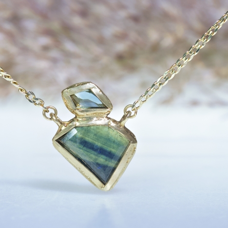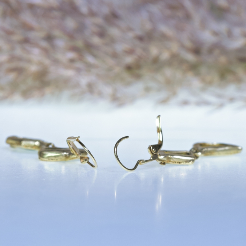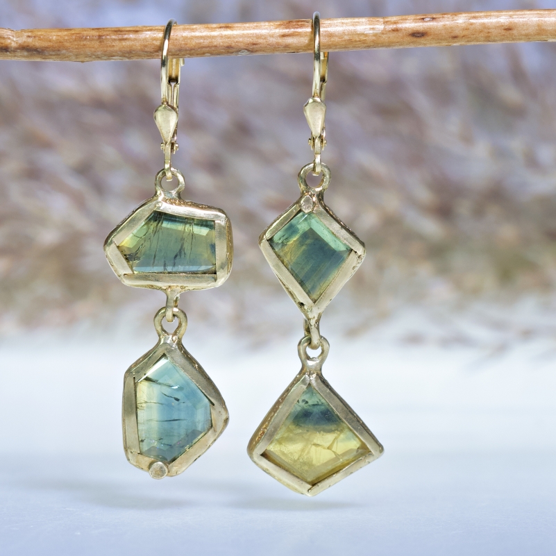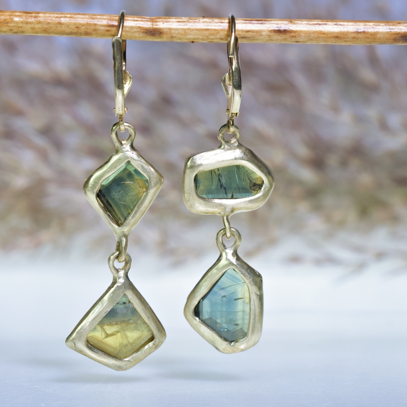 Delší visací zlaté náušnice se čtyřmi nepravidelnými geometrickými vícebarevnými safíry z Keni. Kameny mají barvu žlutou, modrou, zelenou a hnědou. 14k žluté zlato. Zapínání na klapku.