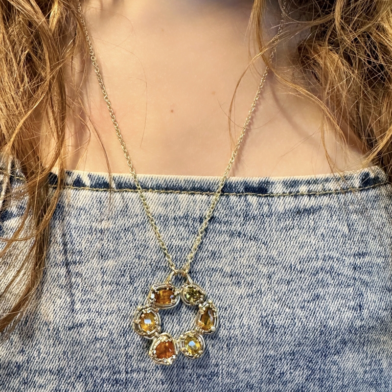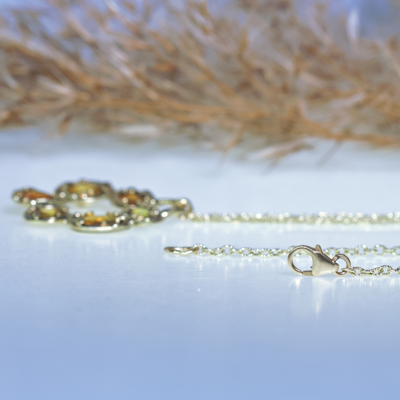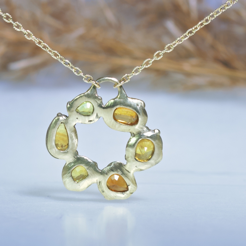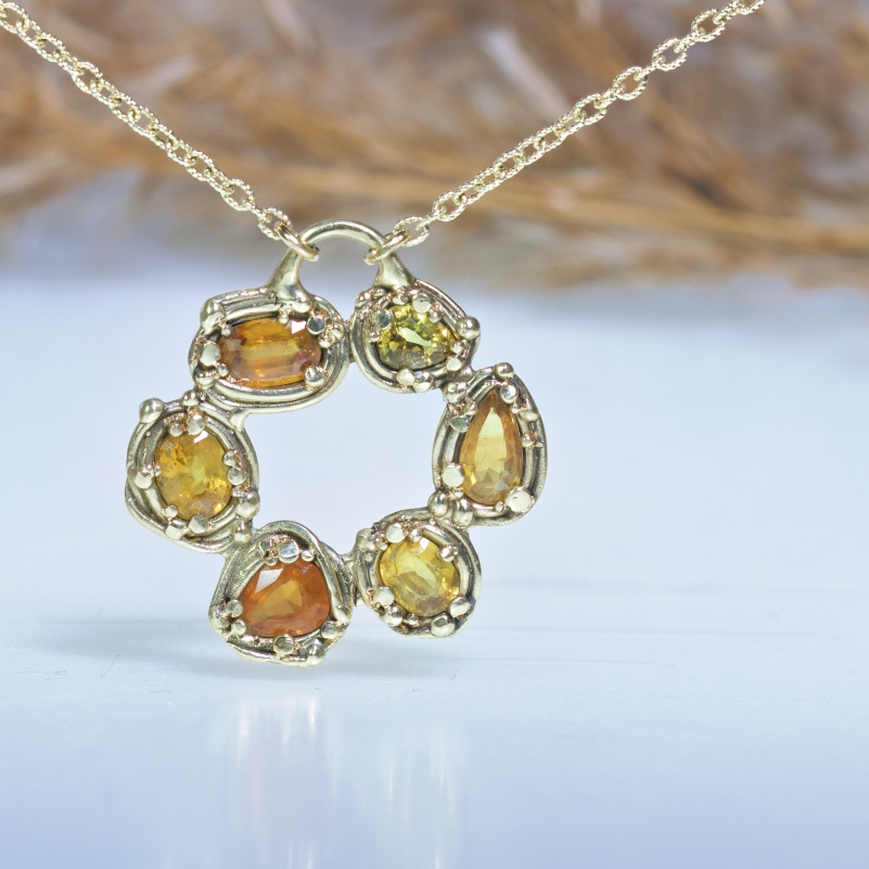 Náhrdelník ve tvaru kruhu se šesti broušenými žlutými safíry v různých odstínech. Prsten do sady lze vytvořit na přání.