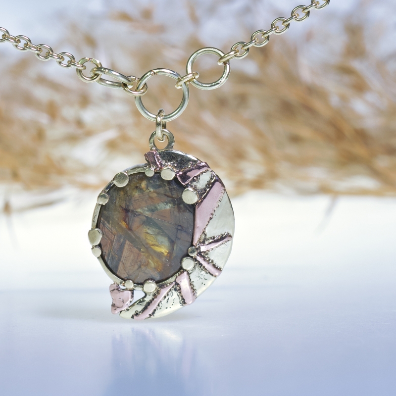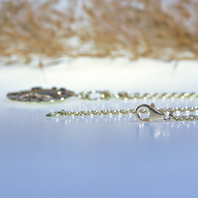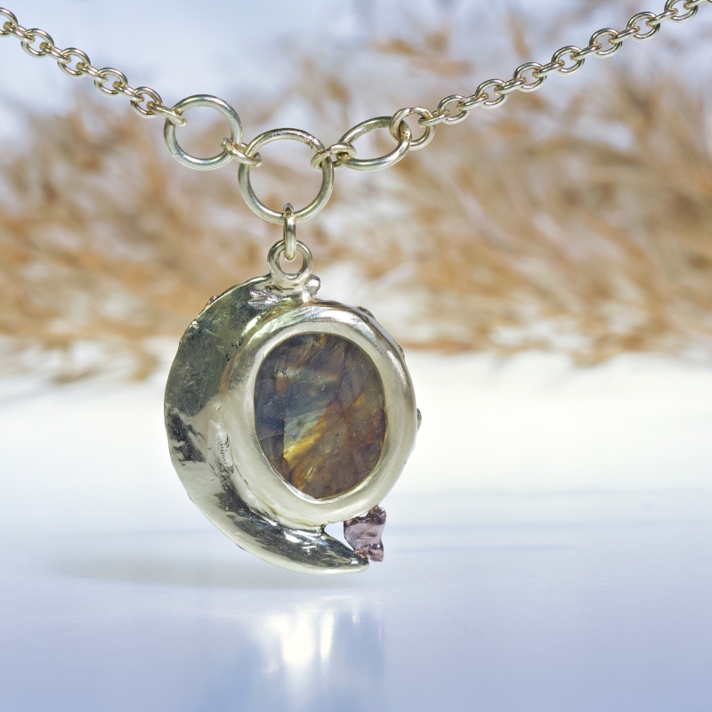 Náhrdelník z 14k žlutého zlata s detaily z růžového zlata s Gold Sheen safírem z vytěženého naleziště v Keni. Kámen je dobrou investiční příležitostí, jeho cena se vzhledem k unikátnosti neustále zvyšuje. Aktuálně je vyhodnocovaný jako druhý nejvzácnější drahokam světa. Na vyžádání ráda pošlu video kamene, protože fotografie nevystihují jeho podstatu.