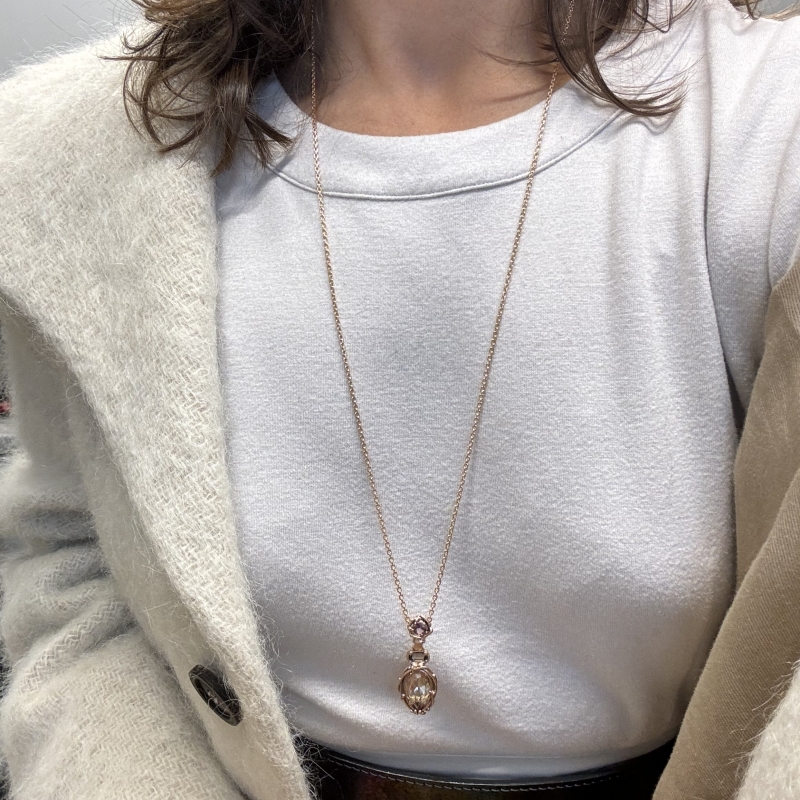 Originální náhrdelník z 14k červeného zlata s oregonským slunečním kamenem a Umba safíry. Sluneční kámen má pastelové barvy a jemný Shiller efekt. Byl broušen v dílně českého brusiče Davida Kempného. Kulatý safír mění barvu v závisloti na osvětlení: od jasně růžové po jemnou pastelovou růžovošedou. Kameny jsou v mém charakteristickém osazení. Náhrdelník by měl být nošen pod oblastí srdce, aby se nepřetáčel a dobře seděl. Celkově je tento šperk vytvotřen tak, aby nás ukotvoval v našem bytí a upevňoval to, čeho jsme dosáhli.