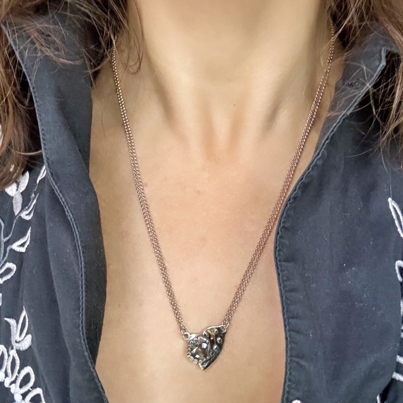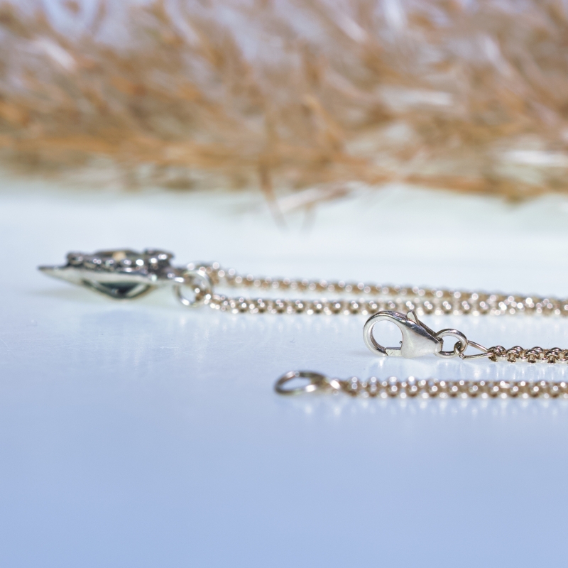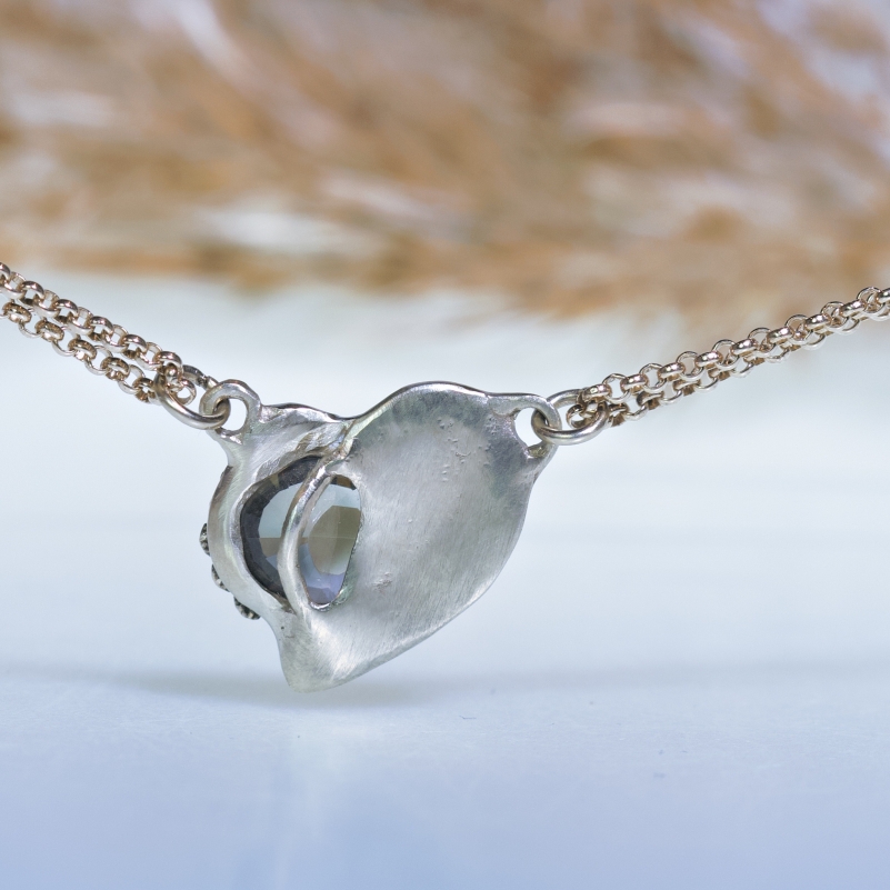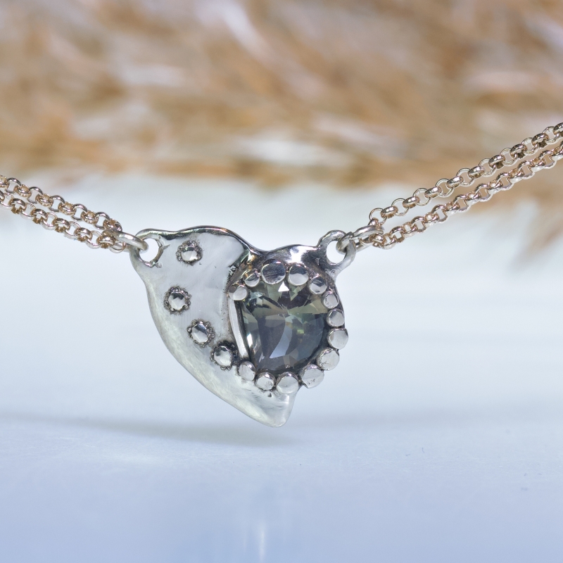 Náhrdelník ze 14k bílého zlata ve tvaru stylizovaného srdce s oregonským slunečním kamenem. Kámen je zelený s nádechem do meruňkova. Dvojitý řetízek.