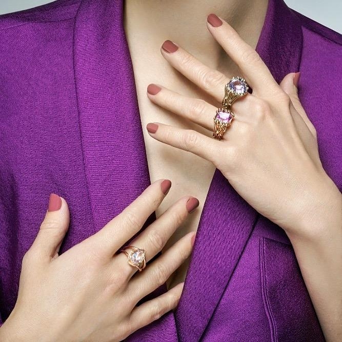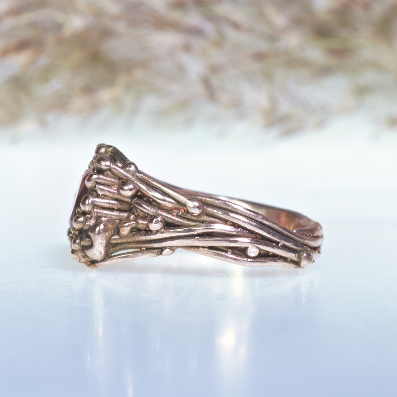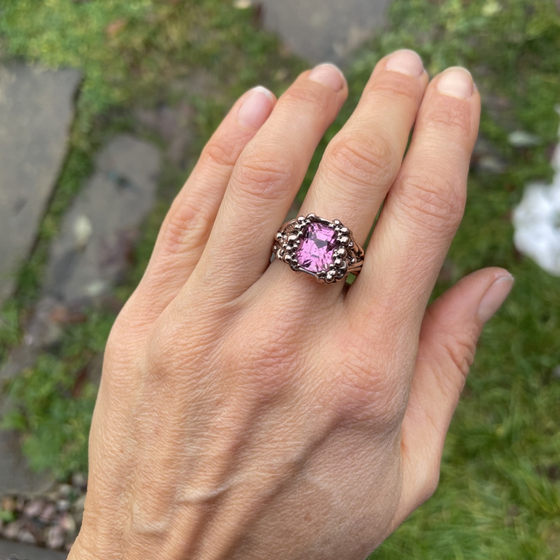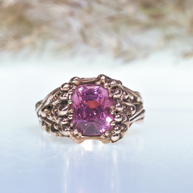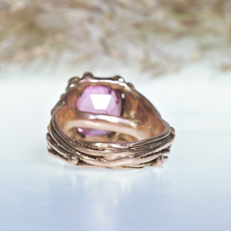 Prsten z červného 14k zlata s jasně růžovým turmalínem. Prsten je v charakteristické obroučce a uchycení typu "galaxy". Turmalín má zářivou růžovou barvu, její hloubka se mírně mění v závislosti na osvětlení. Pouze tento jeden ve velikosti 54-55.