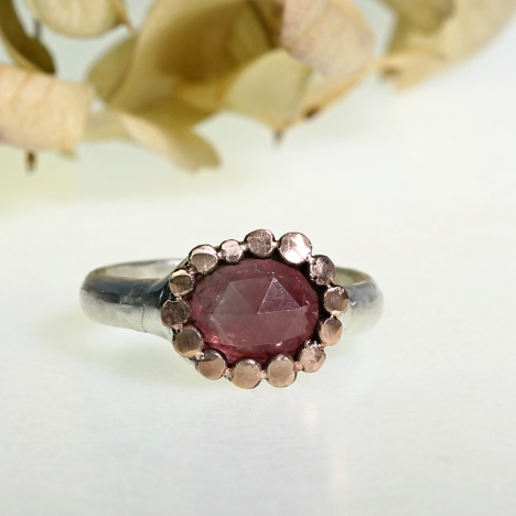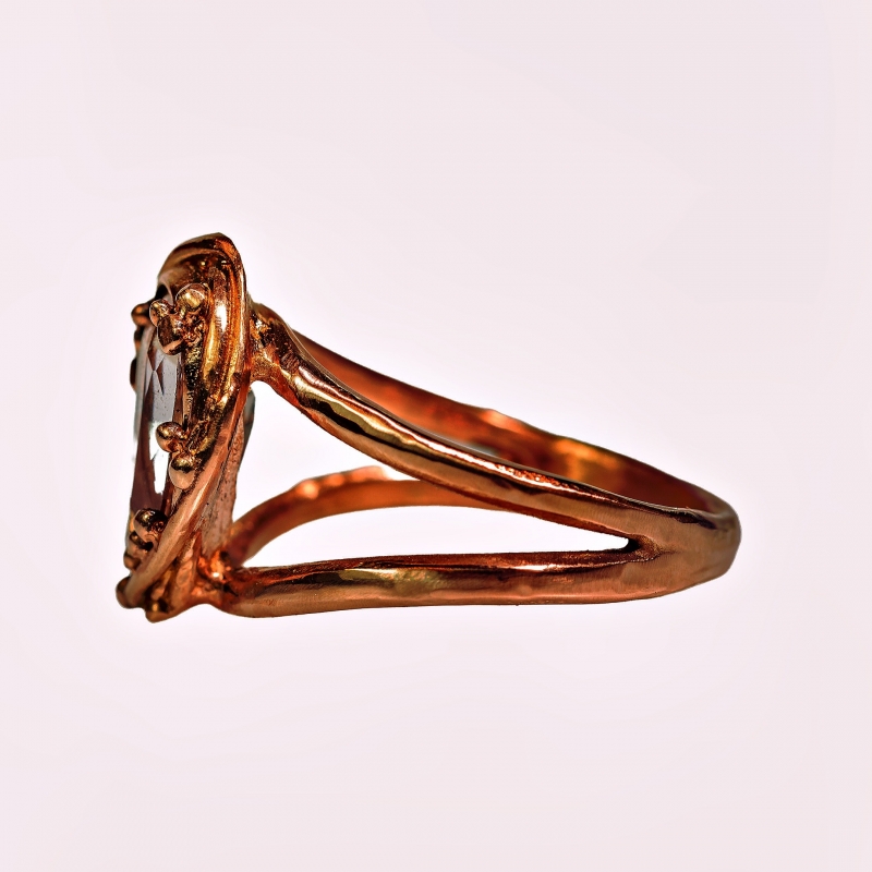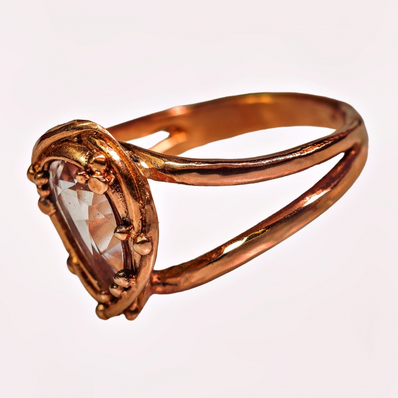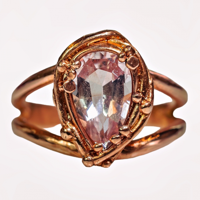 14k zlatý prsten z červeného zlata s broušeným morganitem. Pohodlná obroučka, charakteristické osazení kamene. Vyobrazený ve v. 55.