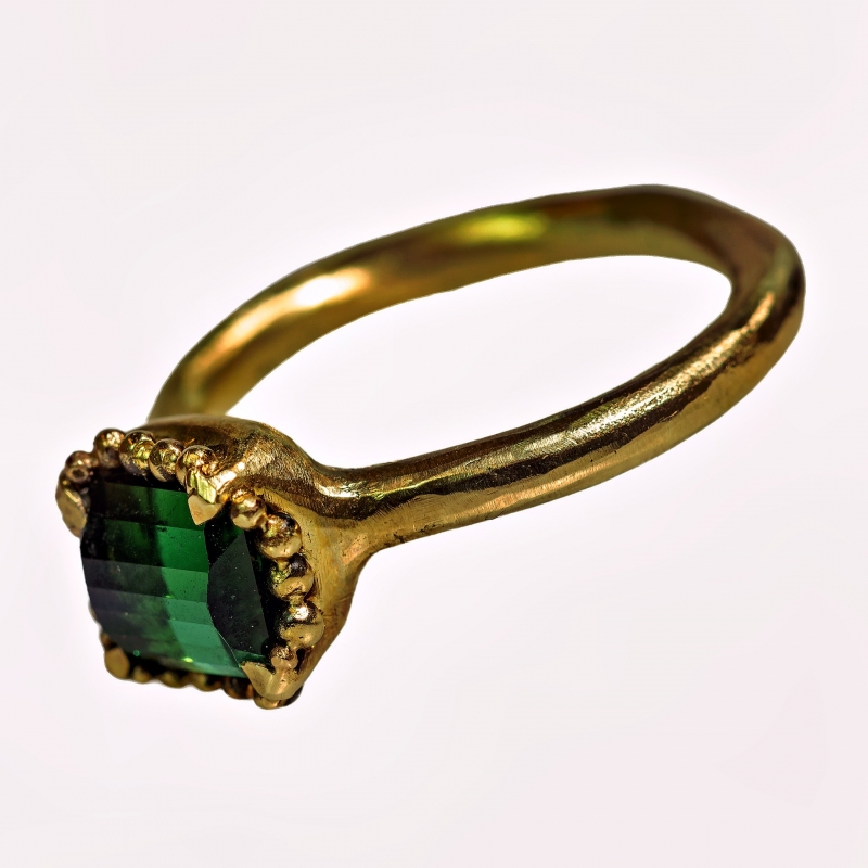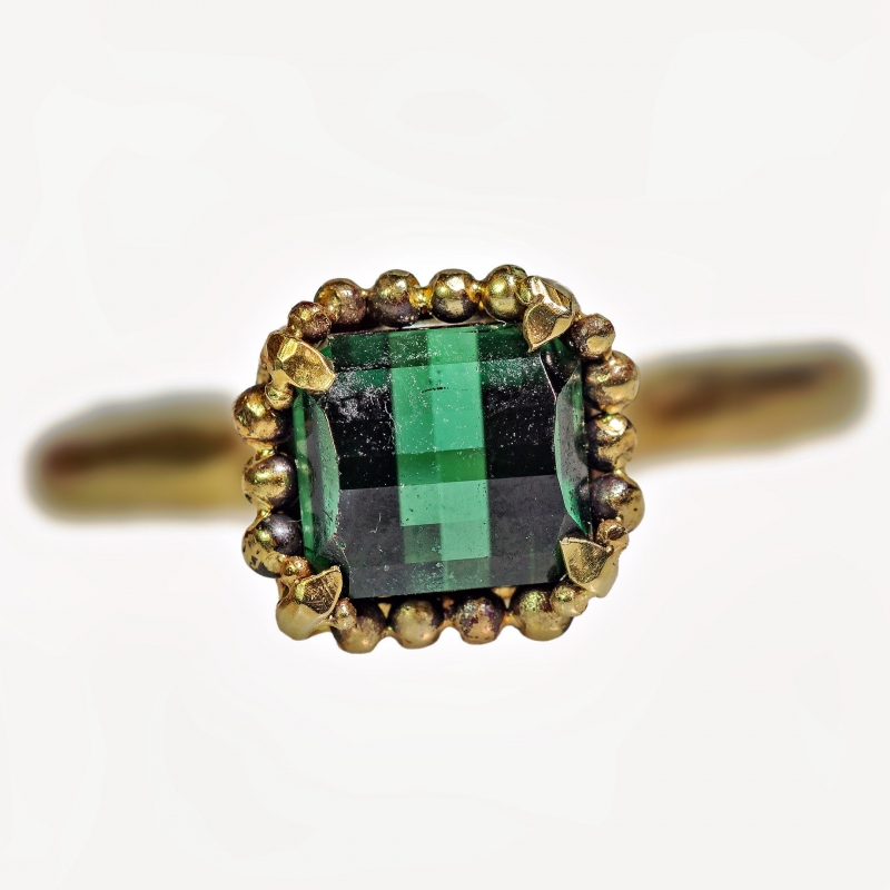 Originální zlatý prsten se zeleným turmalínem v netradičním pixelovém brusu. Kulatá obroučka a dekorativní svatozář kolem kamene. Foto kamene pro výběr zašlu. Cena se můžu lišit u jiné velikosti a kamene.