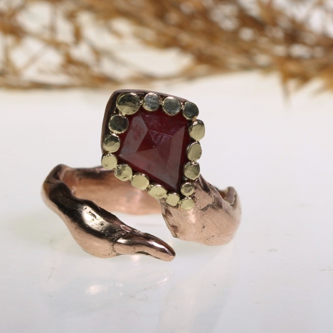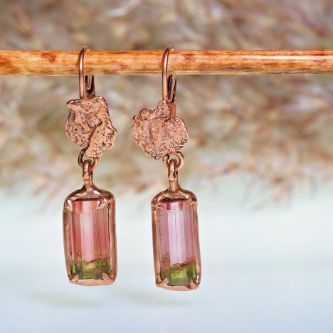 14 k zlatý prsten z červeného zlata s dvěma broušenými morganity ve tvaru kapky. Charakteristické usazení kamenů, jemná organická obroučka. Pouze tento jeden.