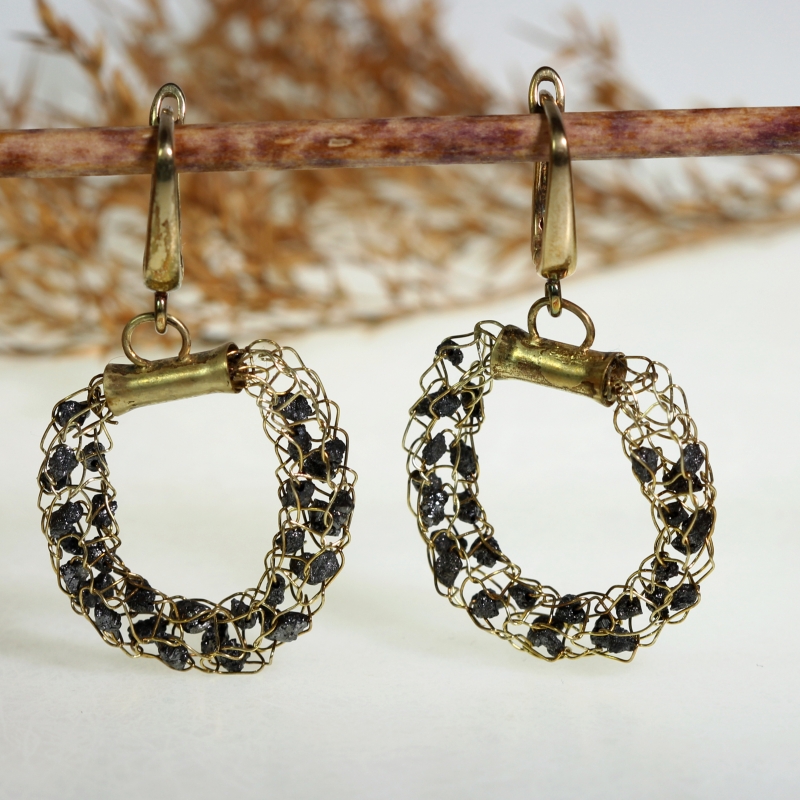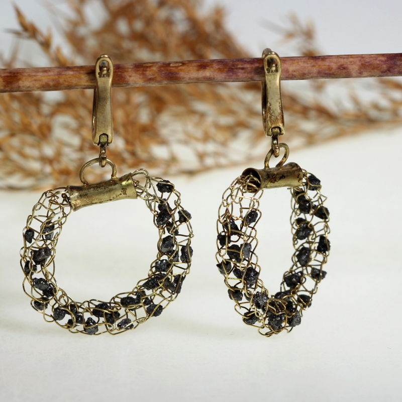Sterling silver circel hanging earrings made from silver wire waved by hand with black rought diamants.