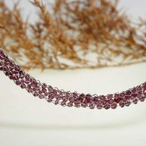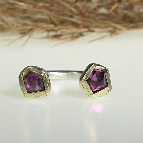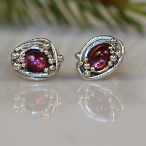 One of a kind lace flower hanging earrings with rose cut rhodolite garnets. 14k gold line around the stone and as a pendant. Simple hook or claps fastening.