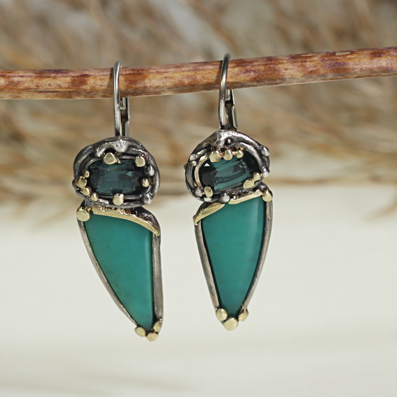 One of a kind hanging earrings with bright green gem silica and green faceted tourmalines. 14k gold details around the stones. Gently oxidized. Claps fastening.
