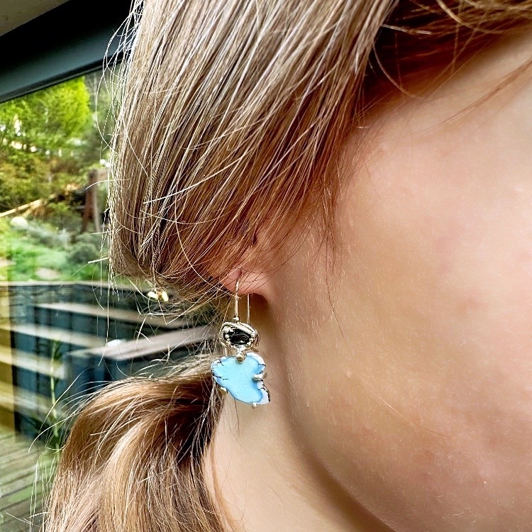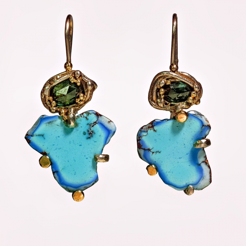One of a kind earrings with freeform lavender turquoise and green sapphire. Simple hook. Original easy to wear earrings. 14k gold details around the stones.