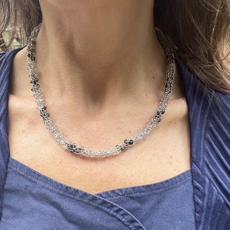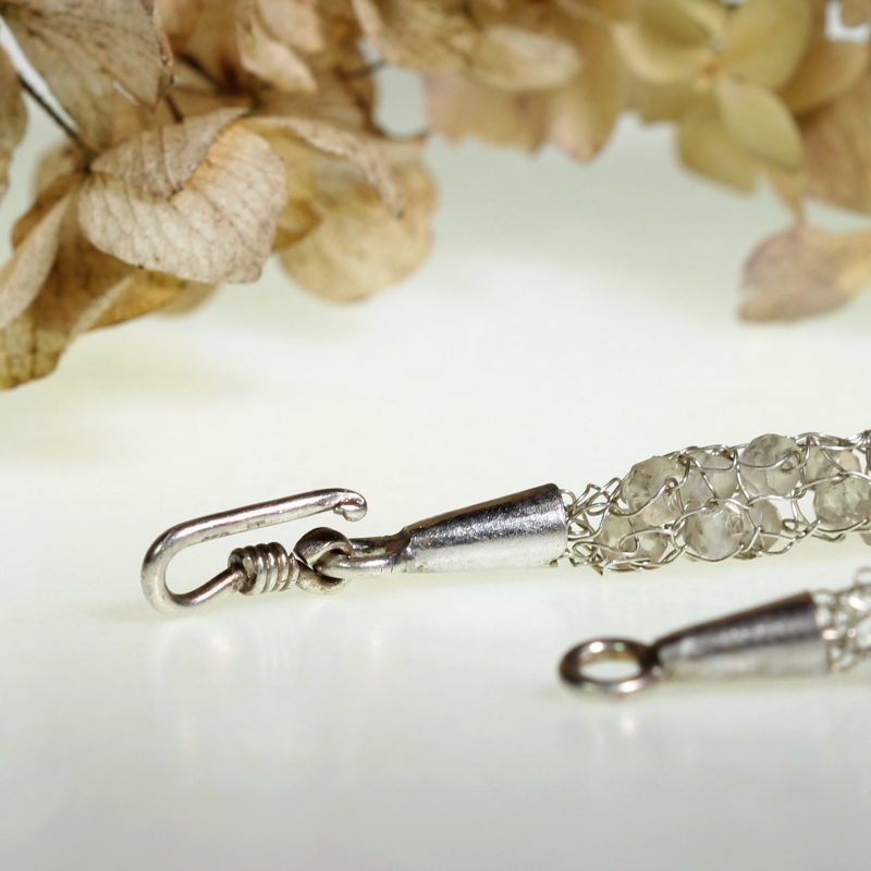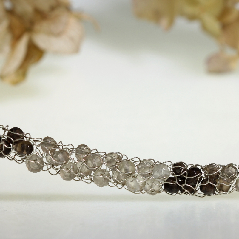 Original sterling silver necklace made from silver wire waved by hand with faceted smoky quartz rondelles (brown - light and dark and white). Fastening by hook.