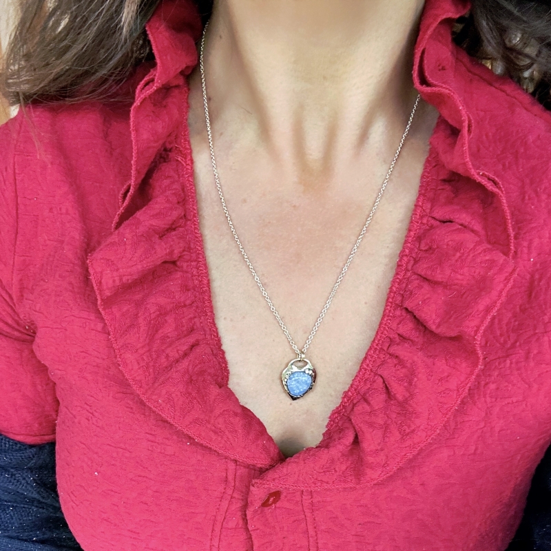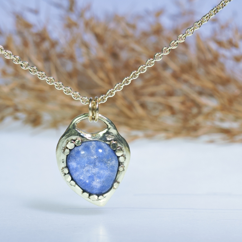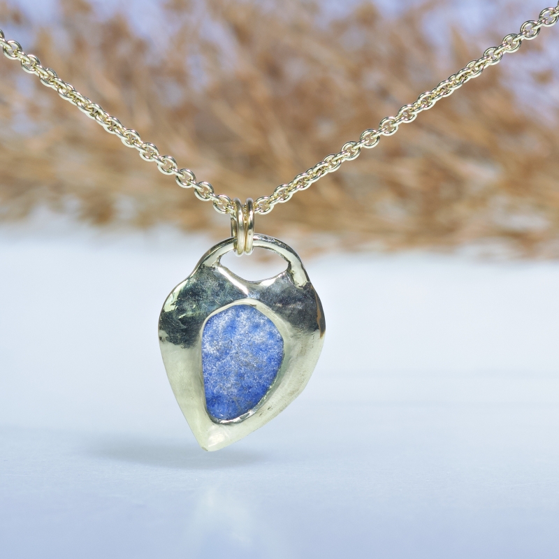 14k gold necklace in the shape of heart with beautiful dumortierite in quartz.